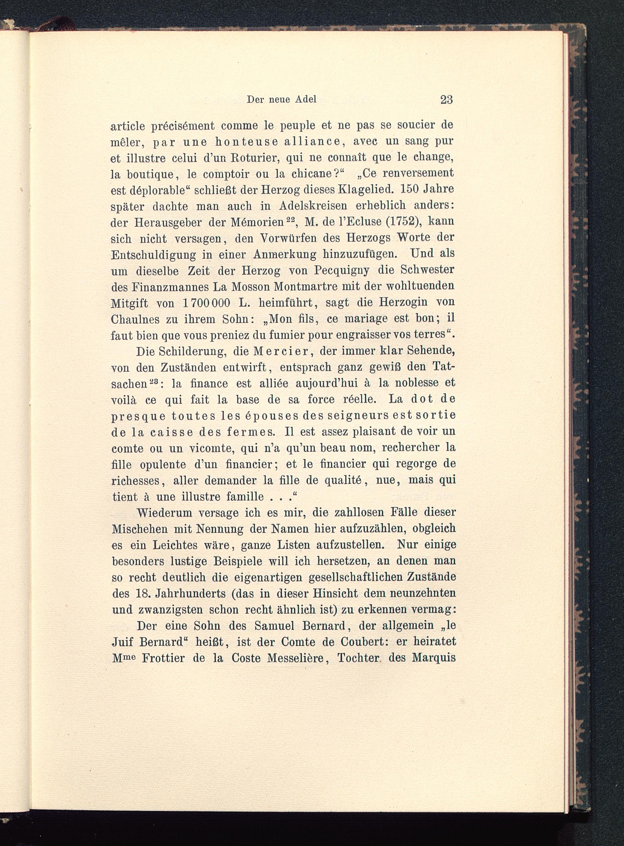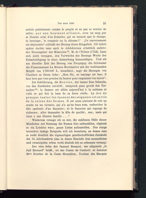 Wiederum versage ich es mir, die zahllosen Fälle dieserMischehen mit Nennung der Namen hier aufzuzählen, obgleiches ein Leichtes wäre, ganze Listen aufzustellen. Nur einigebesonders lustige Beispiele will ich hersetzen, an denen manso recht deutlich die eigenartigen gesellschaftlichen Zuständedes 18. Jahrhunderts (das in dieser Hinsicht dem neunzehntenund zwanzigsten schon recht ähnlich ist) zu erkennen vermag:Der eine Sohn des Samuel Bernard , der allgemein „leJuif Bernard“ heißt, ist der Comte de Coubert: er heiratetM me Frottier de la Coste Messelibre, Tochter des Marquis