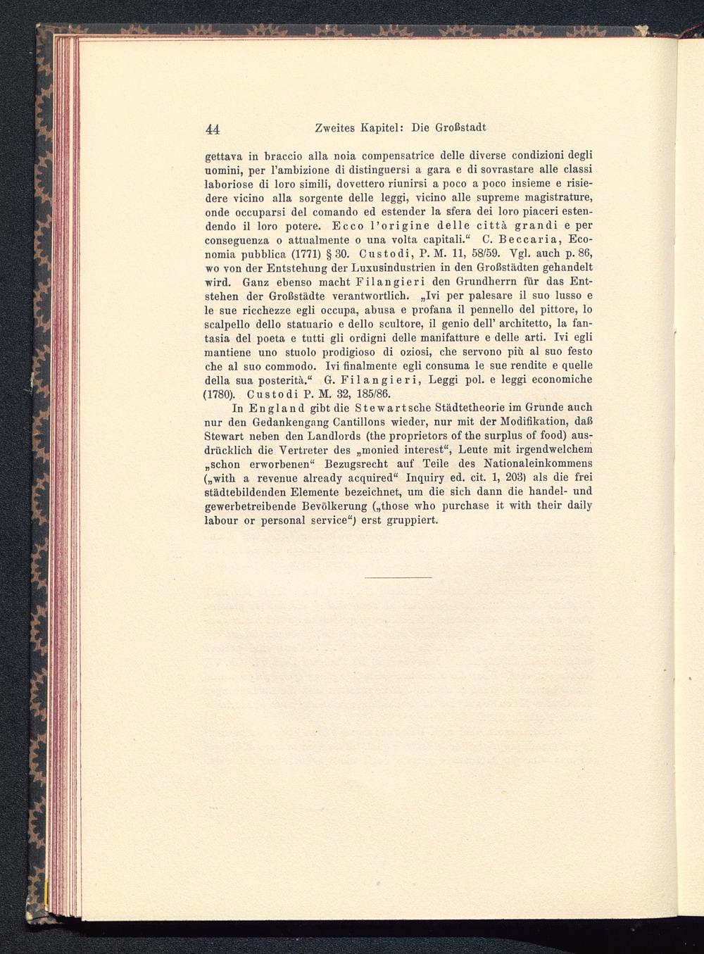 gettava in braccio alla noia compensatrice delle diverse condizioni deglinomini, per l’ambizione di distinguersi a gara e di sovrastare alle classilaboriose di loro simili, dovettero riunirsi a poco a poco insieme e risie-dere vicino alla sorgente delle leggi, vicino alle supreme magistrature,onde occuparsi del comando ed estender la sfera dei loro piaceri esten-dendo il loro potere. Ecco l’origine delle cittä grandi e perconseguenza o attualmente o una volta capitali.“ C. Beccaria, Eco-nomia pubblica (1771) §30. Custodi, P. M. 11, 58/59. Vgl. auch p. 86,wo von der Entstehung der Luxusindustrien in den Großstädten gehandeltwird. Ganz ebenso macht Filangieri den Grundherrn für das Ent-stehen der Großstädte verantwortlich. „Ivi per palesare il suo lusso ele sue ricchezze egli occupa, abusa e profana il pennello del pittore, loscalpello dello statuario e dello scultore, il genio dell’ architetto, la fan-tasia del poeta e tutti gli ordigni delle manifatture e delle arti. Ivi eglimantiene uno stuolo prodigioso di oziosi, che servono piü al suo festoche al suo commodo. Ivi finalmente egli consuma le sue rendite e quelledella sua posteritä.“ G. Filangieri, Leggi pol. e leggi economiche(1780). Custodi P. M. 32, 185/86.