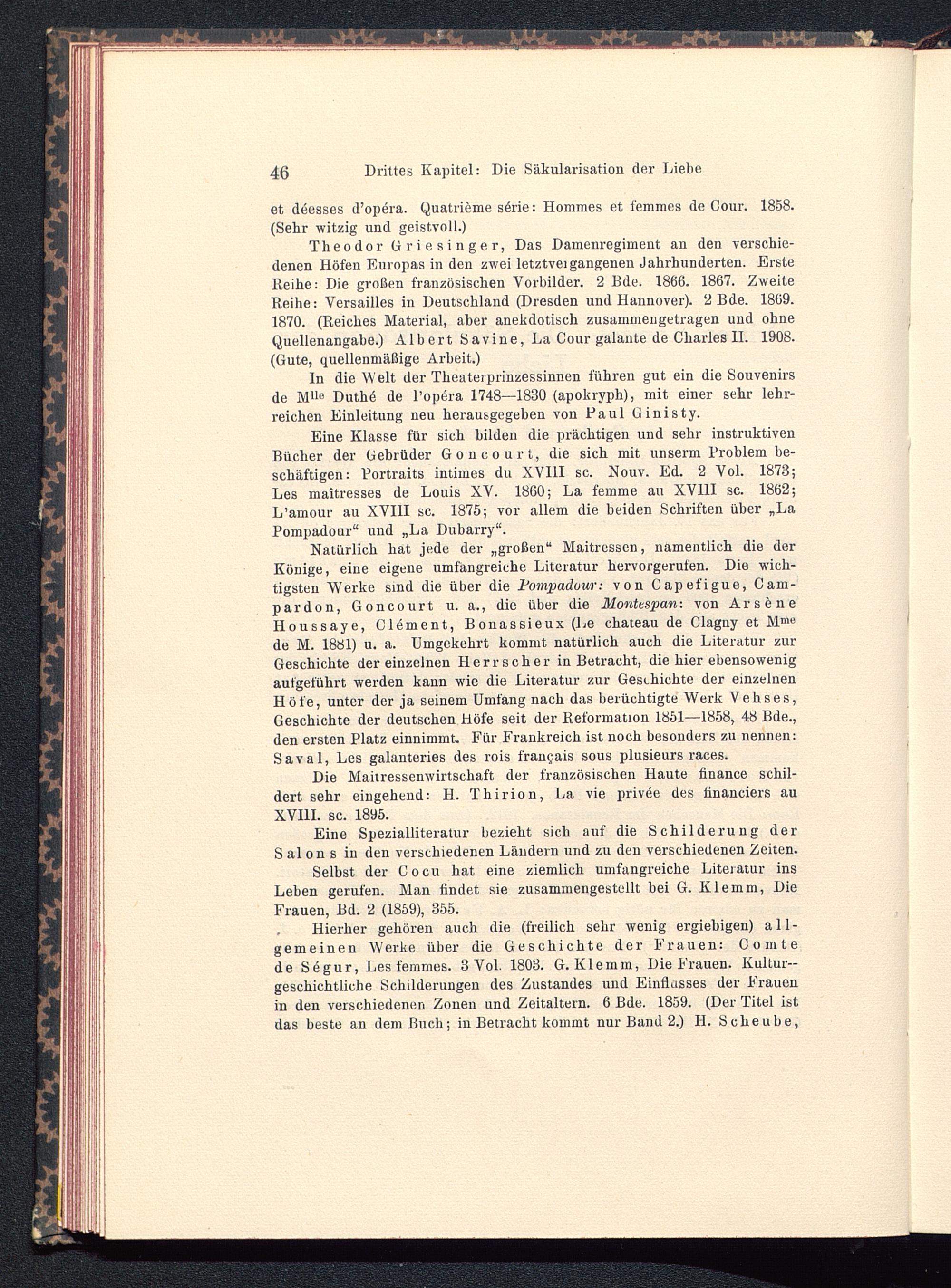 Eine Klasse für sich bilden die prächtigen und sehr instruktivenBücher der Gebrüder Goncourt, die sich mit unserm Problem be-schäftigen: Portraits intimes du XVIII sc. Nouv. Ed. 2 Vol. 1873;Les maitresses de Louis XV. 1860; La femme au XV11I sc. 1862;L’amour au XVIII sc. 1875; vor allem die beiden Schriften über „LaPompadour“ und „La Dubarry“.