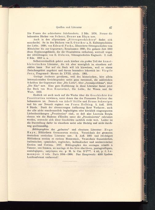 Auch in den allgemeinen „Sittengeschichten“ findet sichmancherlei. So in den Büchern von R. Günther z. B. Kulturgeschichteder Liehe. 1899; von Eduard Fuchs , Illustrierte Sittengeschichte vomMittelalter bis zur Gegenwart; Renaissance 1909; Die galante Zeit 1910(dazu Ergänzungsbände, die die Obszönitäten enthalten), wertvoll wegender Abbildungen; von E. Dühren, Sittengeschichte Englands . 2. Aufl.2 Bde. 1912 u. a.