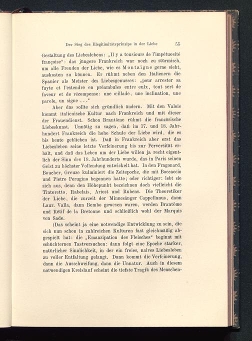 (Das scheint ja eine notwendige Entwicklung zu sein, diesich nun schon in zahlreichen Kulturen fast gleichmäßig ab-gespielt hat: die „Emanzipation des Fleisches“ beginnt mitschüchternen Tastversuchen: dann folgt eine Epoche starker,natürlicher Sinnlichkeit, in der ein freies, naives Liebesiebenzu voller Entfaltung gelangt. Dann kommt die Verfeinerung,dann die Ausschweifung, dann die Unnatur. Auch in diesemnotwendigen Kreislauf scheint die tiefste Tragik des Menschen-