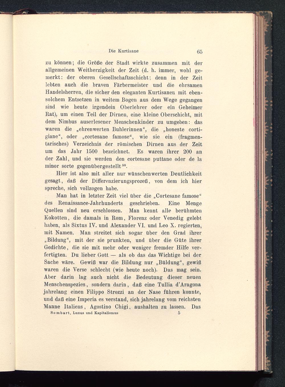 zu können; die Größe der Stadt wirkte zusammen mit derallgemeinen Weitherzigkeit der Zeit (d. h. immer, wohl ge-merkt: der oberen Gesellschaftsschicht; denn in der Zeitlebten auch die braven Färbermeister und die ehrsamenHandelsherren, die sicher den eleganten Kurtisanen mit eben-solchem Entsetzen in weitem Bogen aus dem Wege gegangensind wie heute irgendein Oberlehrer oder ein GeheimerRat), um einen Teil der Dirnen, eine kleine Oberschicht, mitdem Nimbus auserlesener Menschenkinder zu umgeben: daswaren die „ehrenwerten Buhlerinnen“, die „honeste corti-giane“, oder „cortesane famose“, wie sie ein (fragmen-tarisches) Verzeichnis der römischen Dirnen aus der Zeitum das Jahr 1500 bezeichnet. Es waren ihrer 200 ander Zahl, und sie werden den cortesane puttane oder de laminor sorte gegenübergestellt 58 .