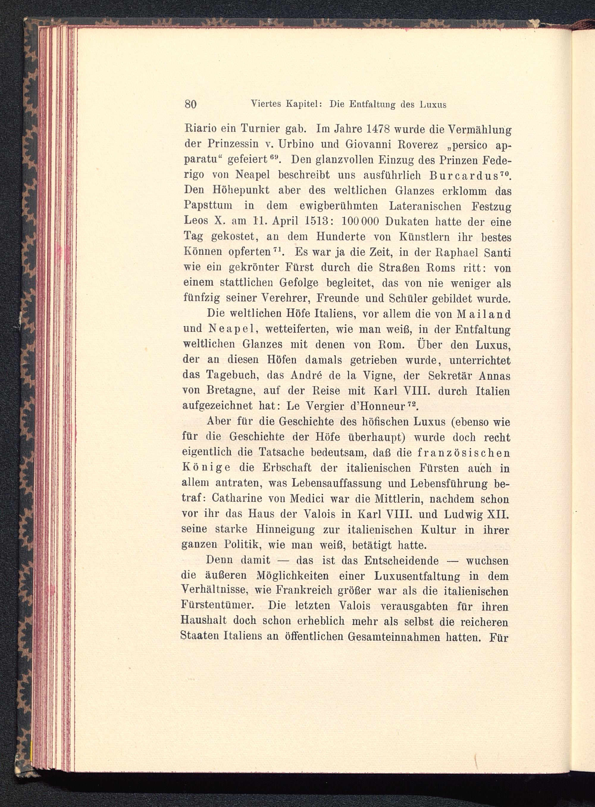 Die weltlichen Höfe Italiens, vor allem die von Mailand und Neapel , wetteiferten, wie man weiß, in der Entfaltungweltlichen Glanzes mit denen von Rom. Über den Luxus,der an diesen Höfen damals getrieben wurde, unterrichtetdas Tagebuch, das Andrö de la Vigne, der Sekretär Annasvon Bretagne, auf der Reise mit Karl VIII. durch Italien aufgezeichnet hat: Le Vergier d’Honneur 72 .