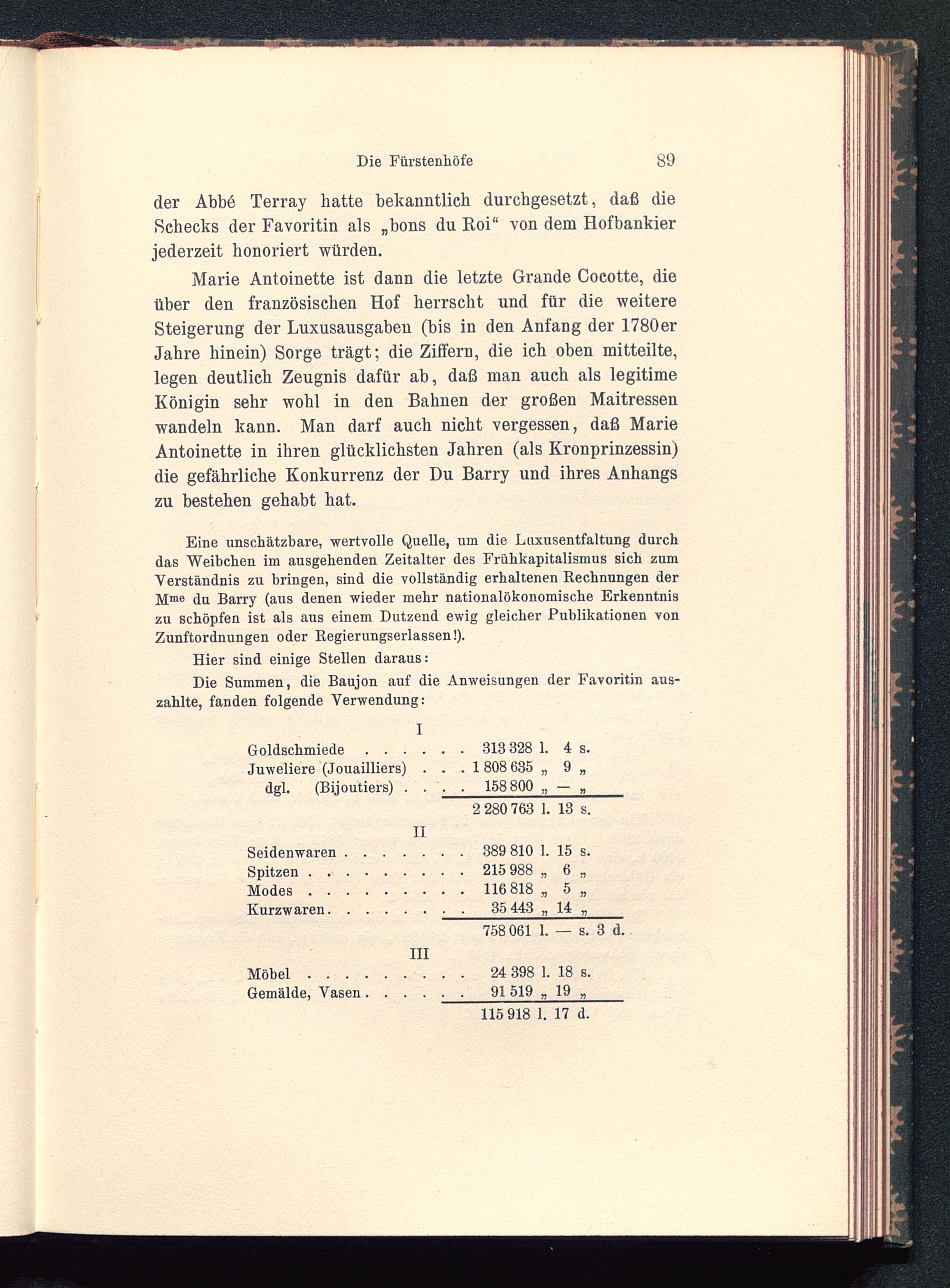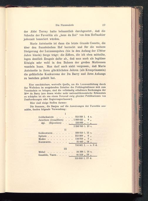 Eine unschätzbare, wertvolle Quelle, um die Luxusentfaltung durchdas Weibchen im ausgehenden Zeitalter des Frühkapitalismus sich zumVerständnis zu bringen, sind die vollständig erhaltenen Rechnungen derM me du Barry (aus denen wieder mehr nationalökonomische Erkenntniszu schöpfen ist als aus einem Dutzend ewig gleicher Publikationen vonZunftordnungen oder Regierungserlassen!).