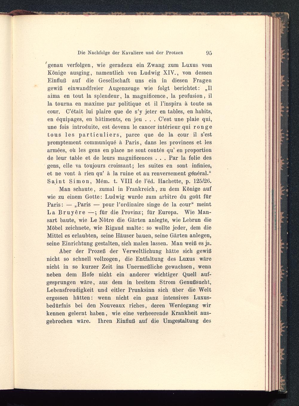'genau verfolgen, wie geradezu ein Zwang zum Luxus vomKönige ausging, namentlich von Ludwig XIV. , von dessenEinfluß auf die Gesellschaft uns ein in diesen Fragengewiß einwandfreier Augenzeuge wie folgt berichtet: „IIaima en tout la splendeur, la magnificence, la profusion, illa tourna en maxime par politique et il l’inspira ä toute sacour. C’ötait lui plaire que de s’y jeter en tables, en habits,en öquipages, en bätiments, en jeu . . . C’est une plaie qui,une fois introduite, est devenu le cancer intörieur qui rongetous les particuliers, parce que de la cour il s’estpromptement communiquö ä Paris, dans les provinees et lesarmöes, ob les gens en place ne sont contös qu’ en proportionde leur table et de leurs magnificences . . . Par la folie desgens, eile va toujours croissant; les suites en sont infinies,et ne vont a rien qu’ ä la ruine et au renversement gdnöral.“Saint Simon, Möm. t. VIII de l’öd. Hachette, p. 125/26.