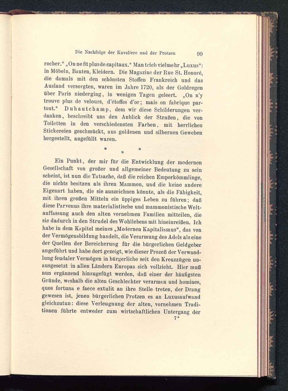 Ein Punkt, der mir für die Entwicklung der modernenGesellschaft von großer und allgemeiner Bedeutung zu seinscheint, ist nun die Tatsache, daß die reichen Emporkömmlinge,die nichts besitzen als ihren Mammon, und die keine andereEigenart haben, die sie auszeichnen könnte, als die Fähigkeit,mit ihren großen Mitteln ein üppiges Leben zu führen; daßdiese Parvenüs ihre materialistische und mammonistische Welt-auffassung auch den alten vornehmen Familien mitteilen, diesie dadurch in den Strudel des Wohllebens mit hineinreißen. Ichhabe in dem Kapitel meines „Modernen Kapitalismus“, das vonder Vermögensbildung handelt, die Verarmung des Adels alseineder Quellen der Bereicherung für die bürgerlichen Geldgeberangeführt und habe dort gezeigt, wie dieser Prozeß der Verwand-lung feudaler Vermögen in bürgerliche seit den Kreuzzügen un-ausgesetzt in allen Ländern Europas sich vollzieht. Hier mußnun ergänzend hinzugefügt werden, daß einer der häufigstenGründe, weshalb die alten Geschlechter verarmen und homines,quos fortuna e faece extulit an ihre Stelle treten, der Dranggewesen ist, jenen bürgerlichen Protzen es an Luxusaufwandgleichzutun: diese Verleugnung der alten, vornehmen Tradi-tionen führte entweder zum wirtschaftlichen Untergang der