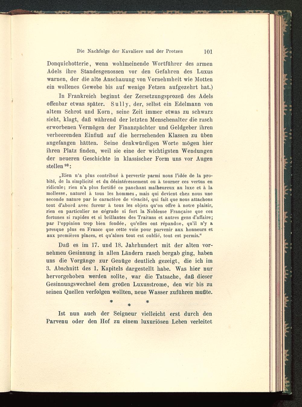 In Frankreich beginnt der Zersetzungsprozeß des Adelsoffenbar etwas später. Sully, der, selbst ein Edelmann vonaltem Schrot und Korn, seine Zeit immer etwas zu schwarzsieht, klagt, daß während der letzten Menschenalter die rascherworbenen Vermögen der Finanzpächter und Geldgeber ihrenverheerenden Einfluß auf die herrschenden Klassen zu übenangefangen hätten. Seine denkwürdigen Worte mögen hierihren Platz finden, weil sie eine der wichtigsten Wendungender neueren Geschichte in klassischer Form uns vor Augenstellen 93 :