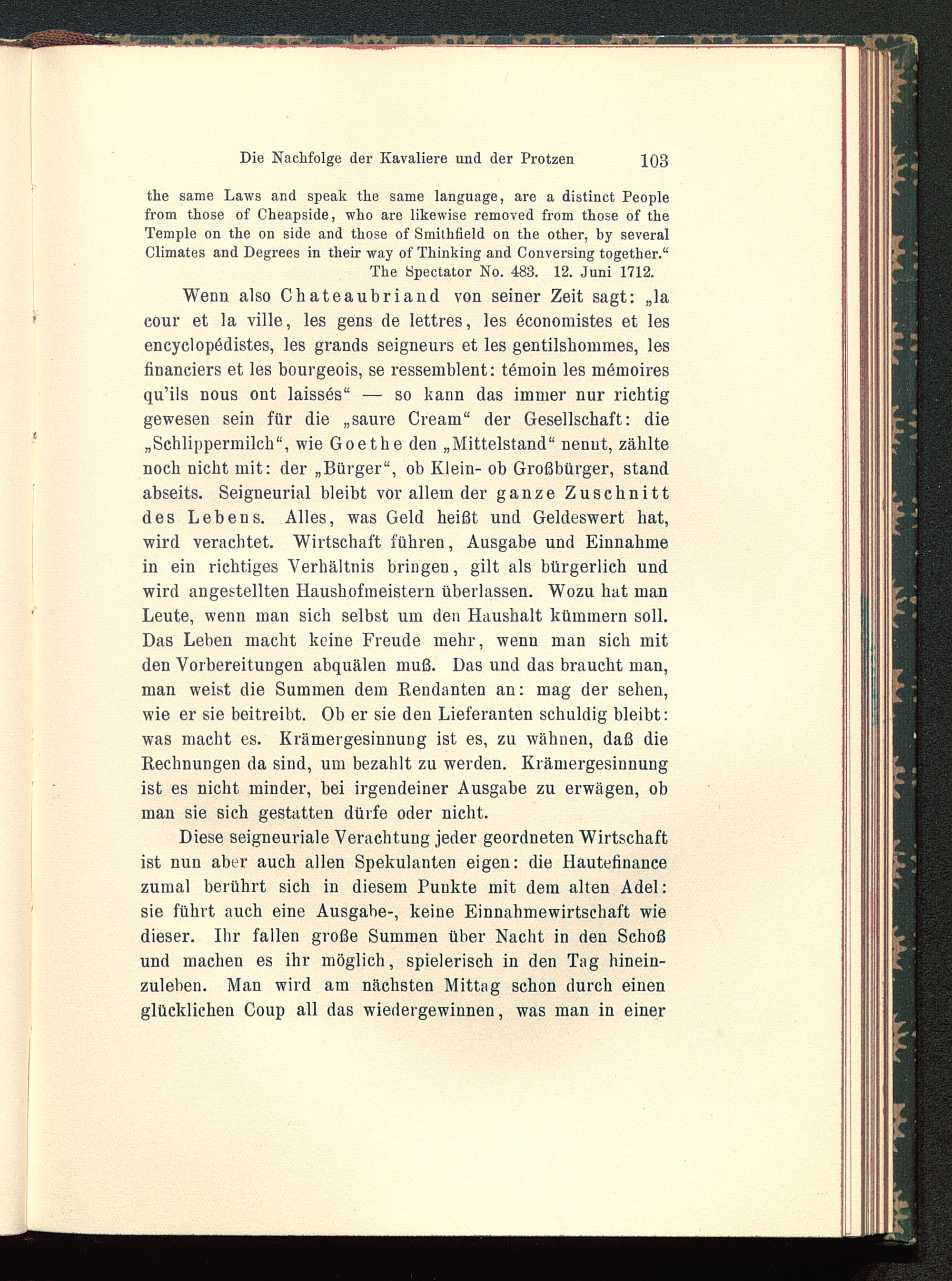 Wenn also Chateaubriand von seiner Zeit sagt: „lacour et la ville, les gens de lettres, les öconomistes et lesencyclopödistes, les grands seigneurs et les gentilshommes, lesfinaneiers et les bourgeois, se ressemblent: tömoin les mdmoiresqu’ils nous ont laissös“ — so kann das immer nur richtiggewesen sein für die „saure Cream“ der Gesellschaft: die„Schlippermilch“, wie Goethe den „Mittelstand“ nennt, zähltenoch nicht mit: der „Bürger“, ob Klein- ob Großbürger, standabseits. Seigneurial bleibt vor allem der ganze Zuschnittdes Lebens. Alles, was Geld heißt und Geldeswert hat,wird verachtet. Wirtschaft führen, Ausgabe und Einnahmein ein richtiges Verhältnis bringen, gilt als bürgerlich undwird angestellten Haushofmeistern überlassen. Wozu hat manLeute, wenn man sich selbst um den Haushalt kümmern soll.Das Leben macht keine Freude mehr, wenn man sich mitden Vorbereitungen abquälen muß. Das und das braucht man,man weist die Summen dem Rendanten an: mag der sehen,wie er sie beitreibt. Ob er sie den Lieferanten schuldig bleibt:was macht es. Krämergesinnung ist es, zu wähnen, daß dieRechnungen da sind, um bezahlt zu werden. Krämergesinnungist es nicht minder, bei irgendeiner Ausgabe zu erwägen, obman sie sich gestatten dürfe oder nicht.