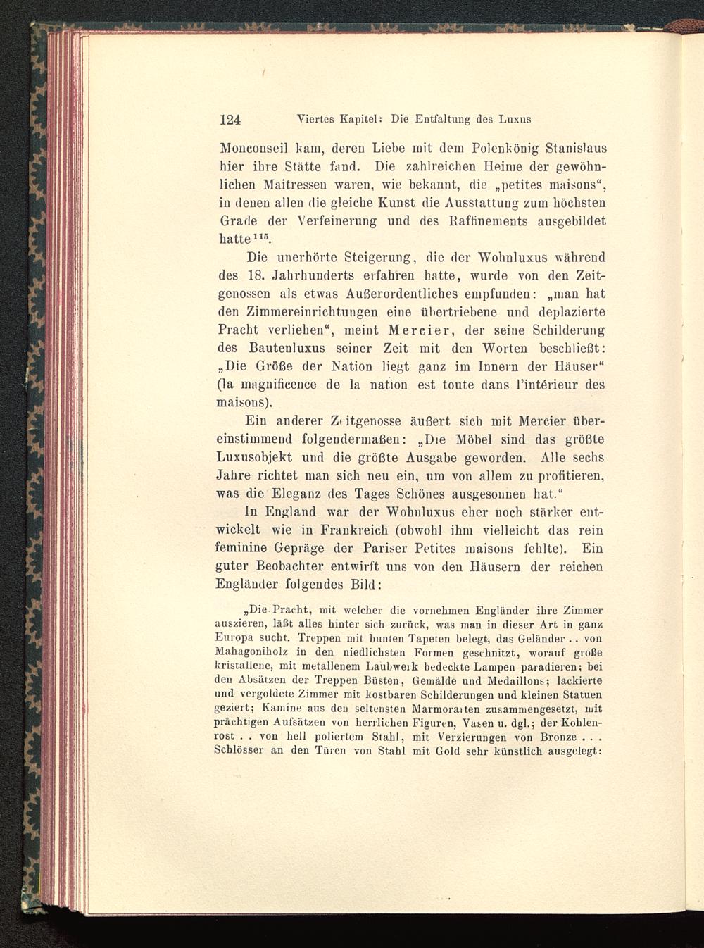 Die unerhörte Steigerung, die der Wohnluxus währenddes 18. Jahrhunderts erfahren hatte, wurde von den Zeit-genossen als etwas Außerordentliches empfunden: „man hatden Zimmereinrichtungen eine übertriebene und deplaziertePracht verliehen“, meint Mercier, der seine Schilderungdes Bautenluxus seiner Zeit mit den Worten beschließt:„Die Größe der Nation liegt ganz im Innern der Häuser“(la magnificence de la nation est toute dans l’intörieur desmaisons).