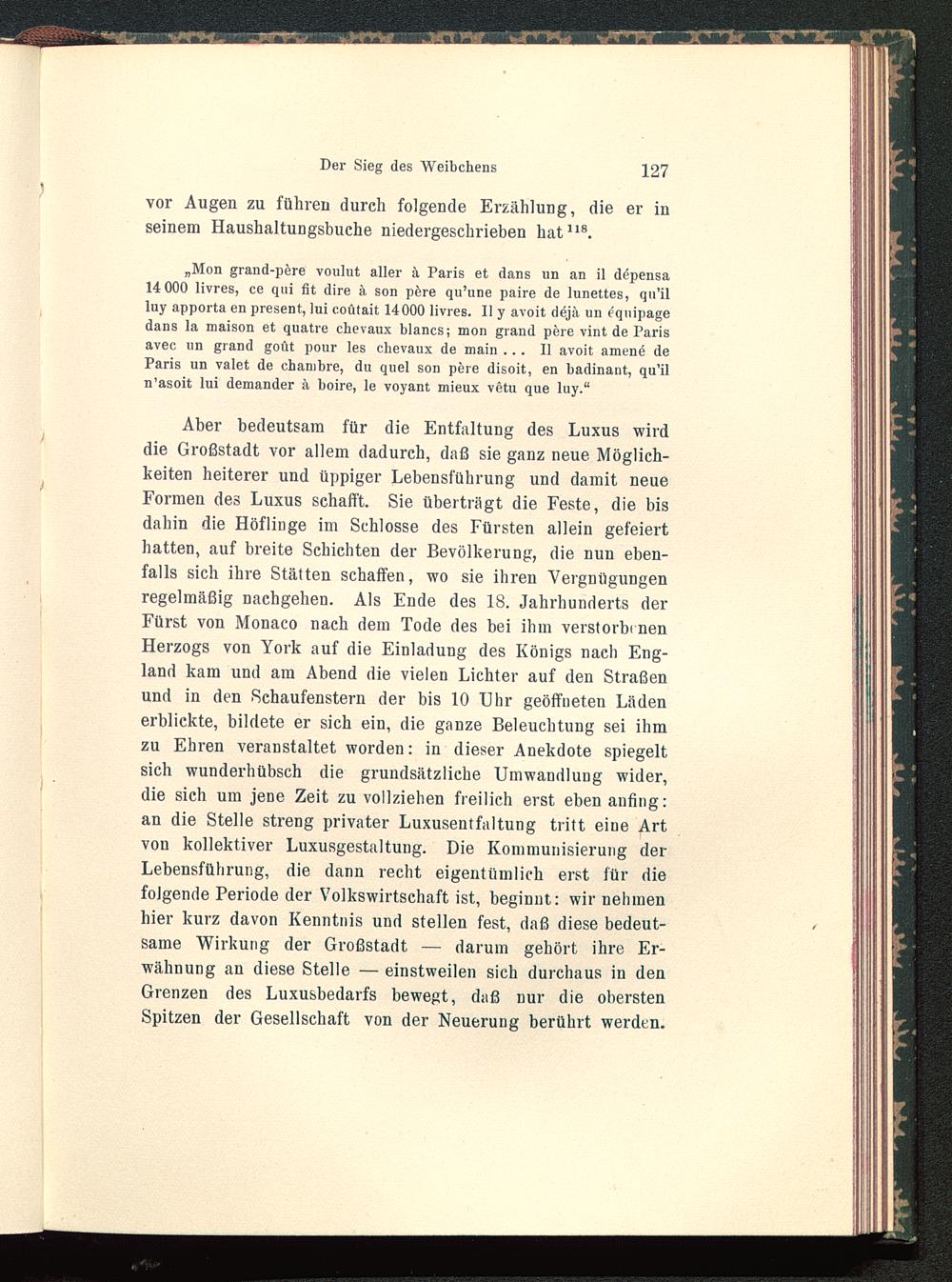 Aber bedeutsam für die Entfaltung des Luxus wirddie Großstadt vor allem dadurch, daß sie ganz neue Möglich-keiten heiterer und üppiger Lebensführung und damit neueFormen des Luxus schafft. Sie überträgt die Feste, die bisdahin die Höflinge im Schlosse des Fürsten allein gefeierthatten, auf breite Schichten der Bevölkerung, die nun eben-falls sich ihre Stätten schaffen, wo sie ihren Vergnügungenregelmäßig nachgehen. Als Ende des 18. Jahrhunderts derFürst von Monaco nach dem Tode des bei ihm verstorbenenHerzogs von York auf die Einladung des Königs nach Eng-land kam und am Abend die vielen Lichter auf den Straßenund in den Schaufenstern der bis 10 Uhr geöffneten Lädenerblickte, bildete er sich ein, die ganze Beleuchtung sei ihmzu Ehren veranstaltet worden: in dieser Anekdote spiegeltsich wunderhübsch die grundsätzliche Umwandlung wider,die sich um jene Zeit zu vollziehen freilich erst eben anfing:an die Stelle streng privater Luxusentfaltung tritt eine Artvon kollektiver Luxusgestaltung. Die Kommunisierung derLebensführung, die dann recht eigentümlich erst für diefolgende Periode der Volkswirtschaft ist, beginnt: wir nehmenhier kurz davon Kenntnis und stellen fest, daß diese bedeut-same Wirkung der Großstadt — darum gehört ihre Er-wähnung an diese Stelle — einstweilen sich durchaus in denGrenzen des Luxusbedarfs bewegt, daß nur die oberstenSpitzen der Gesellschaft von der Neuerung berührt werden.