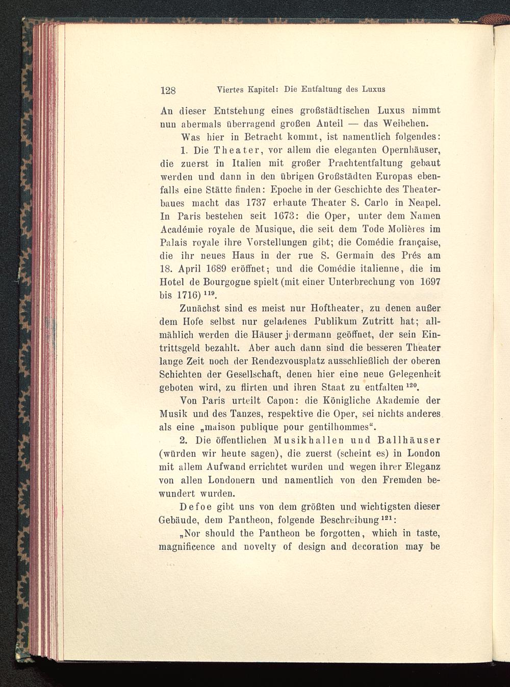 1. Die Theater, vor allem die eleganten Opernhäuser,die zuerst in Italien mit großer Prachtentfaltung gebautwerden und dann in den übrigen Großstädten Europas eben-falls eine Stätte finden: Epoche in der Geschichte des Theater-baues macht das 1787 erbaute Theater S. Carlo in Neapel. In Paris bestehen seit 1G73: die Oper, unter dem NamenAcadömie royale de Musique, die seit dem Tode Moliöres imPalais royale ihre Vorstellungen gibt; die Comödie frangaise,die ihr neues Haus in der rue S. Germain des PiAs am18. April 1689 eröffnet; und die Comüdie italienne, die imHotel de Bourgogue spielt (mit einer Unterbrechung von 1697bis 1716) 119 .