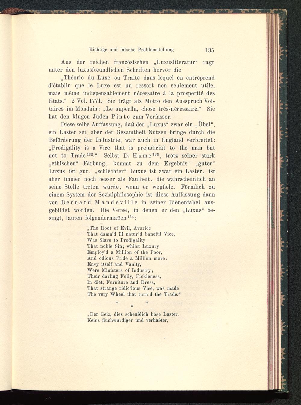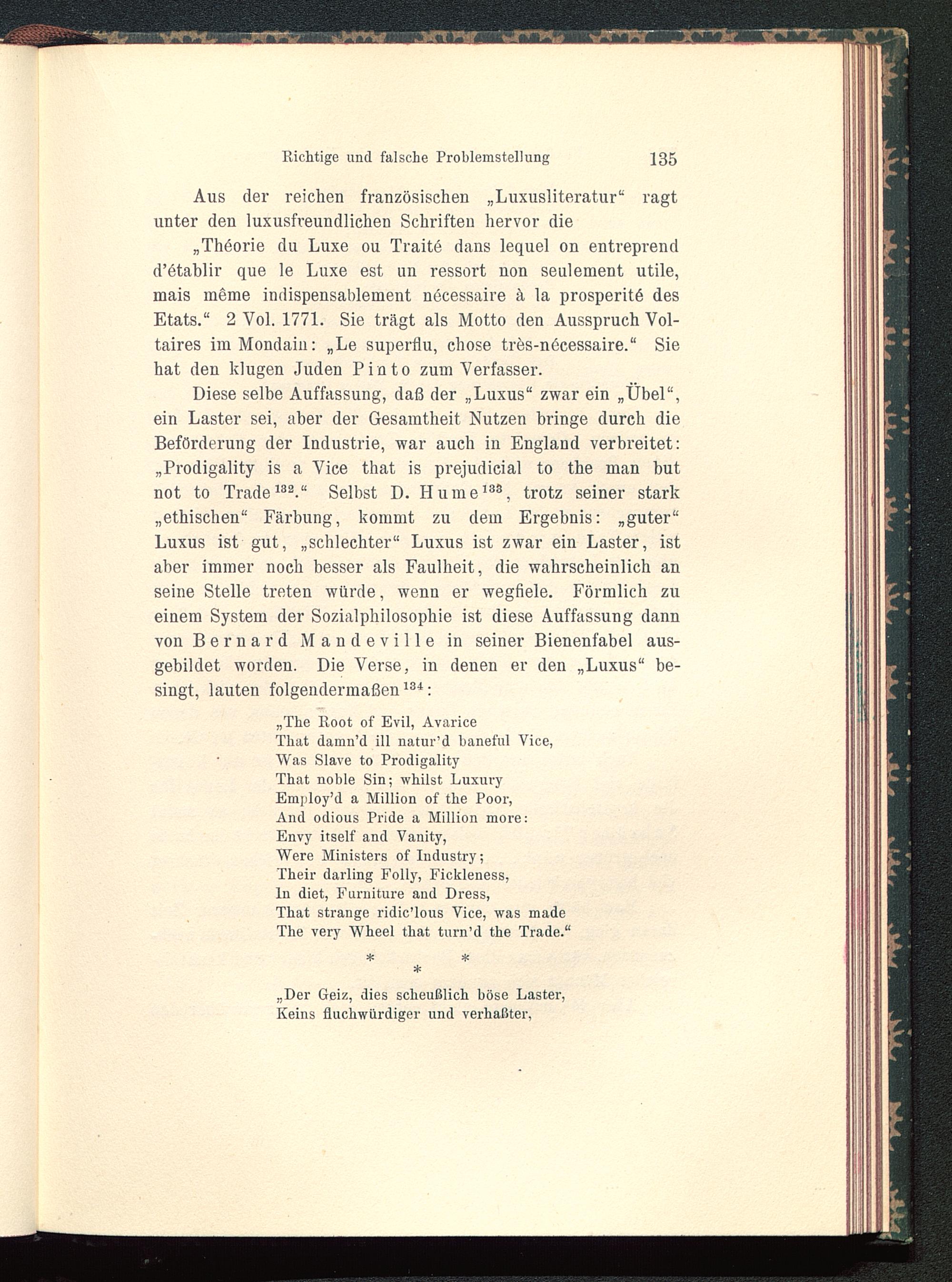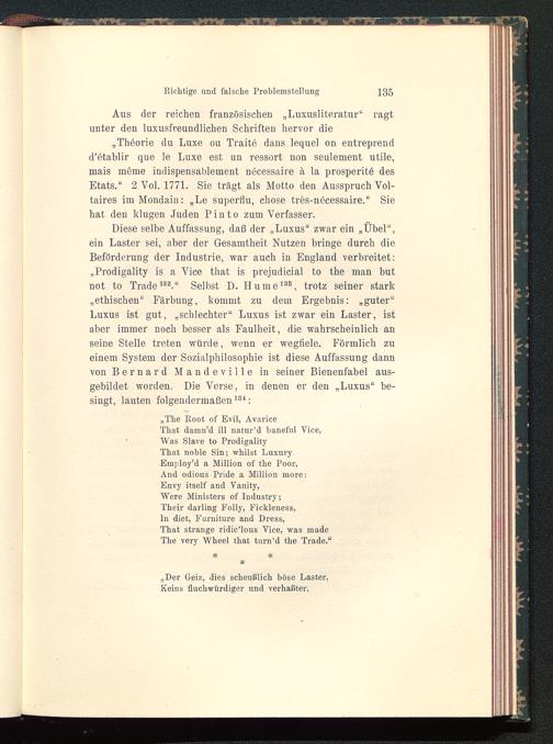 Diese selbe Auffassung, daß der „Luxus“ zwar ein „Übel“,ein Laster sei, aber der Gesamtheit Nutzen bringe durch dieBeförderung der Industrie, war auch in England verbreitet:„Prodigality is a Vice that is prejudicial to the man butnot to Trade 132 .“ Selbst D. Hume 138 , trotz seiner stark„ethischen“ Färbung, kommt zu dem Ergebnis: „guter“Luxus ist gut, „schlechter“ Luxus ist zwar ein Laster, istaber immer noch besser als Faulheit, die wahrscheinlich anseine Stelle treten würde, wenn er wegfiele. Förmlich zueinem System der Sozialphilosophie ist diese Auffassung dannvon Bernard Mandeville in seiner Bienenfabel aus-gebildet worden. Die Verse, in denen er den „Luxus “ be-singt, lauten folgendermaßen 134 :