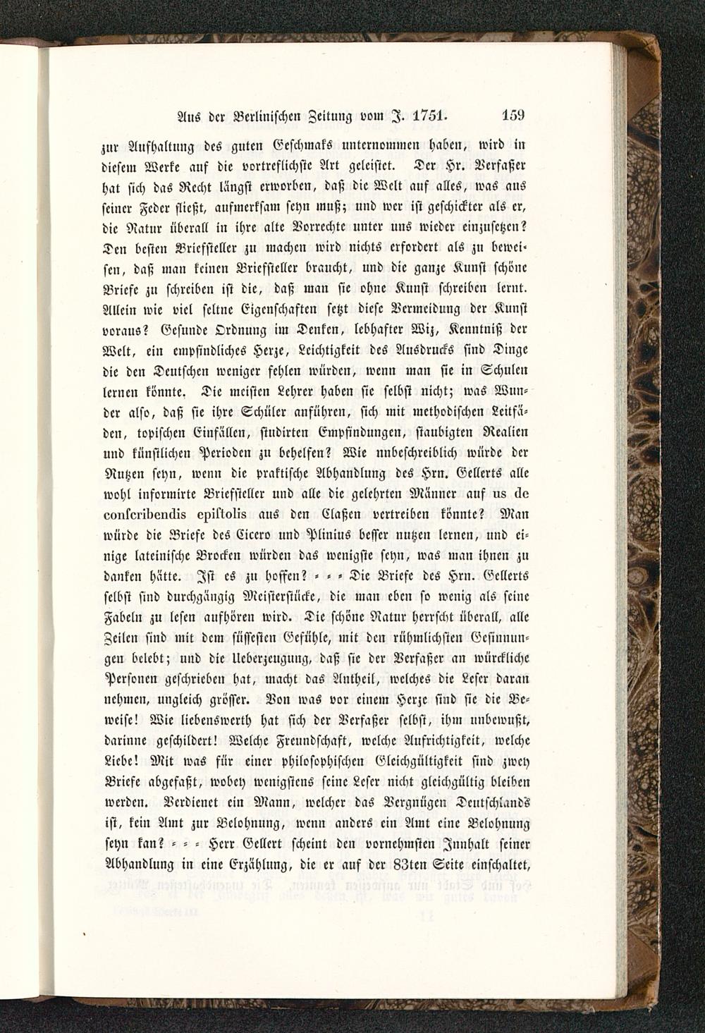 zur Aufhaltung des guten EcschmakS untcrnomincn haben, wird indiesem Werke auf die vortrcflichstc Art geleistet. Dcr Hr. Vcrfaßerhat sich das Recht längst erworben, daß die Welt auf alles, was ausseiner Feder fließt, aufmerksam seyn muß; und wer ist geschickter als er,die Natur überall in ihre alte Vorrechte unter uns wieder einzusetzen?Den beste» Briefsteller zu machen wird nichts erfordert als zu bewei-sen, daß man keinen Briefsteller braucht, und die ganze Kunst schöneBriefe zu schreiben ist die, daß man sie ohne Kunst schreiben lernt.Allein wie viel seltne Eigenschaften setzt diese Vermeidung der Kunstvoraus? Gesunde Ordnung im Denken, lebhafter Wiz, Kenntniß dcrWelt, ein empfindliches Herze, Leichtigkeit des Ausdrucks sind Dingedie den Deutschen weniger fehlen würden, wenn man sie in Schulenlernen könnte. Die meisten Lehrer haben sie selbst nicht; was Wun-der also, daß ste ihre Schüler anführen, sich mit methodischen Leitfä-den, topischcn Einfällen, studirten Empfindungen, stanbigten Realienund künstlichen Perioden zn behelfen? Wie unbeschreiblich würde dcrNutzen seyn, wenn die praktische Abhandlung des Hrn. Eellcrts allewohl informirte Briefsteller uud alle die gelehrten Männer auf us cleemckoi-idenüis vjMolls aus den Claßcn vertreiben könnte? Manwürde die Briefe des Cicero und Plinius besser nutzen lernen, und ei-nige lateinische Brocken würden das wenigste seyn, was mau ihnen zudanken hätte. Ist es zu hoffen? - - - Die Briefe des Hrn. GcllcrtSselbst sind durchgängig Meisterstücke, die man eben so wenig als seineFabeln zu lesen aufhören wird. Die schöne Natur herrscht überall, alleFeilen sind mit dem süsscstcn Gefühle, mit den rühmlichsten Gesinnun-gen belebt; und die Ueberzeugung, daß sie dcr Vcrfaßcr an würcklichcPersonen geschrieben hat, macht das Antheil, welches die Leser darannehmen, ungleich grösser. Bon was vor einem Herze sind sie die Be-weise! Wie licbenswcrth hat sich dcr Nerfaßer selbst, ihm unbewußt,darinne geschildert! Welche Freundschaft, welche Aufrichtigkeit, welcheLiebe! Mit was für einer philosophischen Gleichgültigkeit sind zweyBriefe abgefaßt, wobey wenigstens seine Leser nicht gleichgültig bleibenwerden. Verdienet ein Mann, welcher das Vergnügen Deutschlands ist, kein Amt zur Belohnung, wenn anders ein Amt eine Belohnungseyn kan? - - - Herr Ecllcrt scheint den vornehmsten Jnnhalt seinerAbhandlung in eine Erzählung, die er auf dcr 83ten Seite einschaltet,
