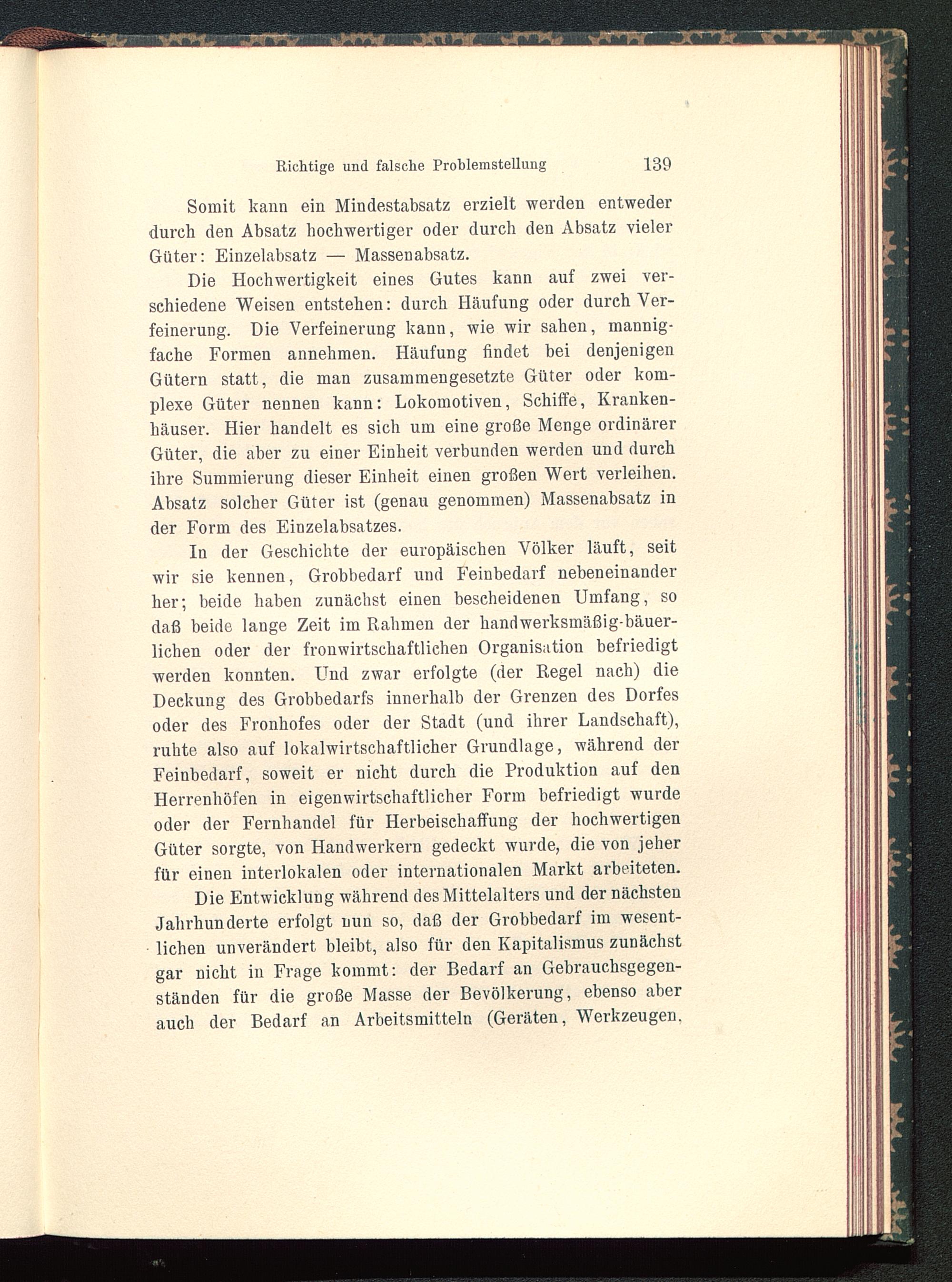 In der Geschichte der europäischen Völker läuft, seitwir sie kennen, Grobbedarf und Feinbedarf nebeneinanderher; beide haben zunächst einen bescheidenen Umfang, sodaß beide lange Zeit im Rahmen der handwerksmäßig-bäuer-lichen oder der fronwirtschaftlichen Organisation befriedigtwerden konnten. Und zwar erfolgte (der Regel nach) dieDeckung des Grobbedarfs innerhalb der Grenzen des Dorfesoder des Fronhofes oder der Stadt (und ihrer Landschaft),ruhte also auf lokalwirtschaftlicher Grundlage, während derFeinbedarf, soweit er nicht durch die Produktion auf denHerrenhöfen in eigenwirtschaftlicher Form befriedigt wurdeoder der Fernhandel für Herbeischaffung der hochwertigenGüter sorgte, von Handwerkern gedeckt wurde, die von jeherfür einen interlokalen oder internationalen Markt arbeiteten.