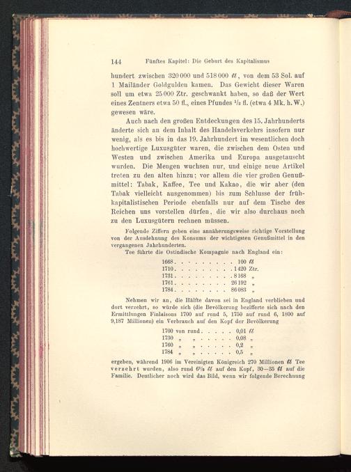 Auch nach den großen Entdeckungen des 15. Jahrhundertsänderte sich an dem Inhalt des Handelsverkehrs insofern nurwenig, als es bis in das 19. Jahrhundert im wesentlichen dochhochwertige Luxusgüter waren, die zwischen dem Osten undWesten und zwischen Amerika und Europa ausgetauschtwurden. Die Mengen wuchsen nur, und einige neue Artikeltreten zu den alten hinzu; vor allem die vier großen Genuß-mittel: Tabak, Kaffee, Tee und Kakao, die wir aber (denTabak vielleicht ausgenommen) bis zum Schlüsse der früh-kapitalistischen Periode ebenfalls nur auf dem Tische desReichen uns vorstellen dürfen, die wir also durchaus nochzu den Luxusgütern rechnen müssen.