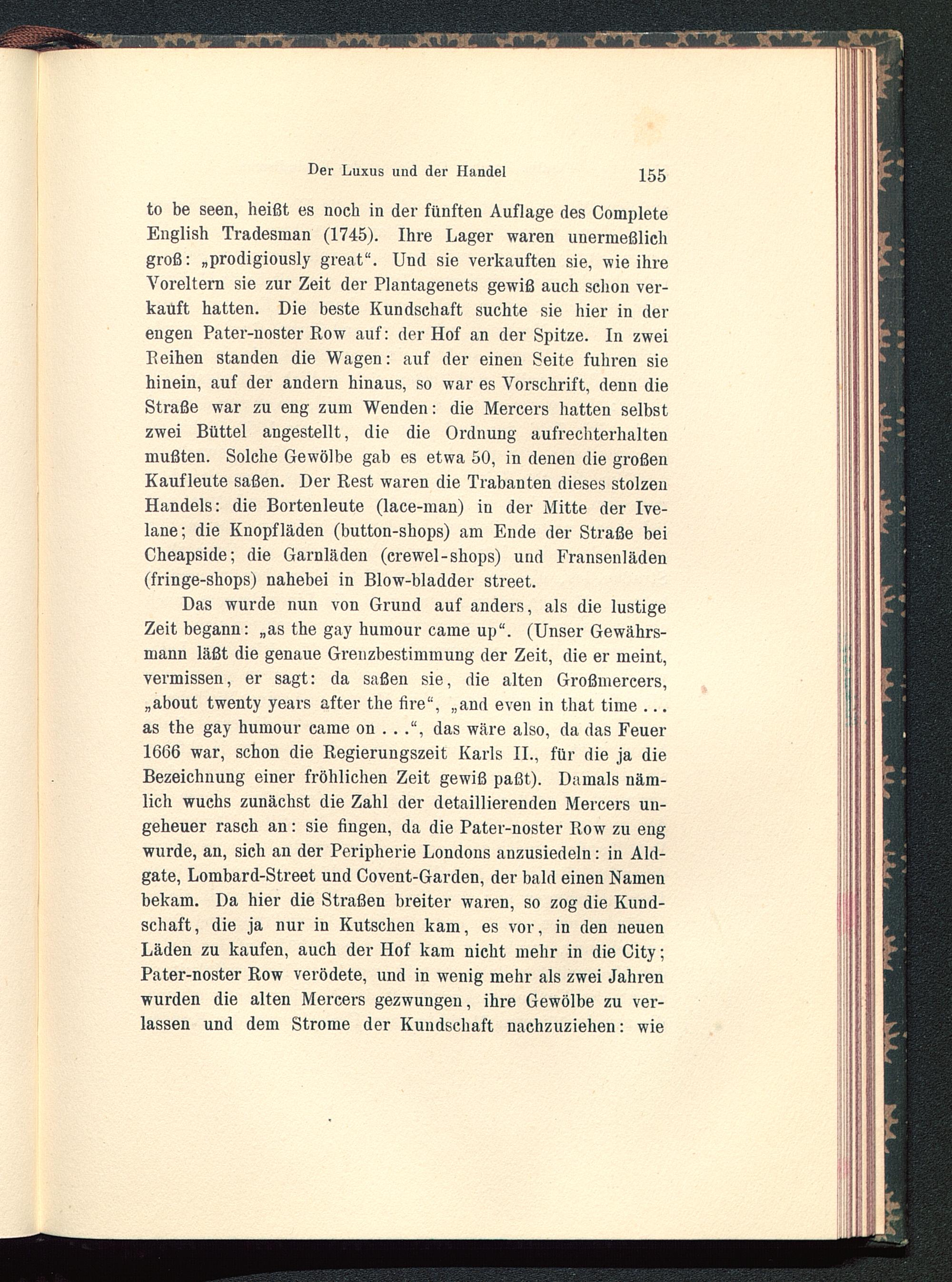 Das wurde nun von Grund auf anders, als die lustigeZeit begann: „as the gay humour came up“. (Unser Gewährs-mann läßt die genaue Grenzbestimmung der Zeit, die er meint,vermissen, er sagt: da saßen sie, die alten Großmercers,„about twenty years after the fire“, „and even in that time ...as the gay humour came on . . .“, das wäre also, da das Feuer1666 war, schon die Regierungszeit Karls II. , für die ja dieBezeichnung einer fröhlichen Zeit gewiß paßt). Damals näm-lich wuchs zunächst die Zahl der detaillierenden Mercers un-geheuer rasch an: sie fingen, da die Pater-noster Row zu engwurde, an, sich an der Peripherie Londons anzusiedeln: in Ald-gate, Lombard-Street und Covent-Garden, der bald einen Namenbekam. Da hier die Straßen breiter waren, so zog die Kund-schaft, die ja nur in Kutschen kam, es vor, in den neuenLäden zu kaufen, auch der Hof kam nicht mehr in die City;Pater-noster Row verödete, und in wenig mehr als zwei Jahrenwurden die alten Mercers gezwungen, ihre Gewölbe zu ver-lassen und dem Strome der Kundschaft nachzuziehen: wie