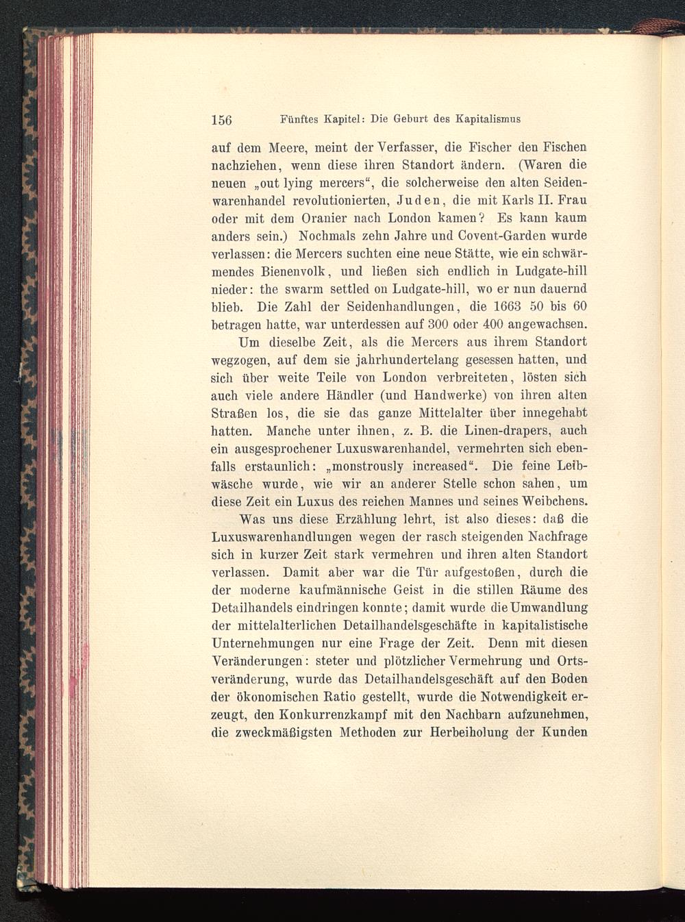 auf dem Meere, meint der Verfasser, die Fischer den Fischennachziehen, wenn diese ihren Standort ändern. (Waren dieneuen „out lying mercers“, die solcherweise den alten Seiden-warenhandel revolutionierten, Juden, die mit Karls II. Frauoder mit dem Oranier nach London kamen? Es kann kaumanders sein.) Nochmals zehn Jahre und Covent-Garden wurdeverlassen: die Mercers suchten eine neue Stätte, wie ein schwär-mendes Bienenvolk, und ließen sich endlich in Ludgate-hillnieder: the swarm settled on Ludgate-hill, wo er nun dauerndblieb. Die Zahl der Seidenhandlungen, die 1663 50 bis 60betragen hatte, war unterdessen auf 300 oder 400 angewachsen.