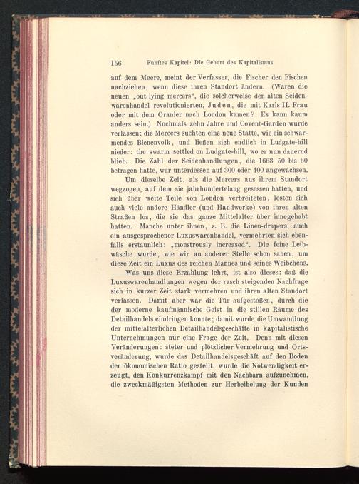 Was uns diese Erzählung lehrt, ist also dieses: daß dieLuxuswarenhandlungen wegen der rasch steigenden Nachfragesich in kurzer Zeit stark vermehren und ihren alten Standortverlassen. Damit aber war die Tür aufgestoßen, durch dieder moderne kaufmännische Geist in die stillen Räume desDetailhandels eindringen konnte; damit wurde die Umwandlungder mittelalterlichen Detailhandelsgeschäfte in kapitalistischeUnternehmungen nur eine Frage der Zeit. Denn mit diesenVeränderungen: steter und plötzlicher Vermehrung und Orts-veränderung, wurde das Detailhandelsgeschäft auf den Bodender ökonomischen Ratio gestellt, wurde die Notwendigkeit er-zeugt, den Konkurrenzkampf mit den Nachbarn aufzunehmen,die zweckmäßigsten Methoden zur Herbeiholung der Kunden