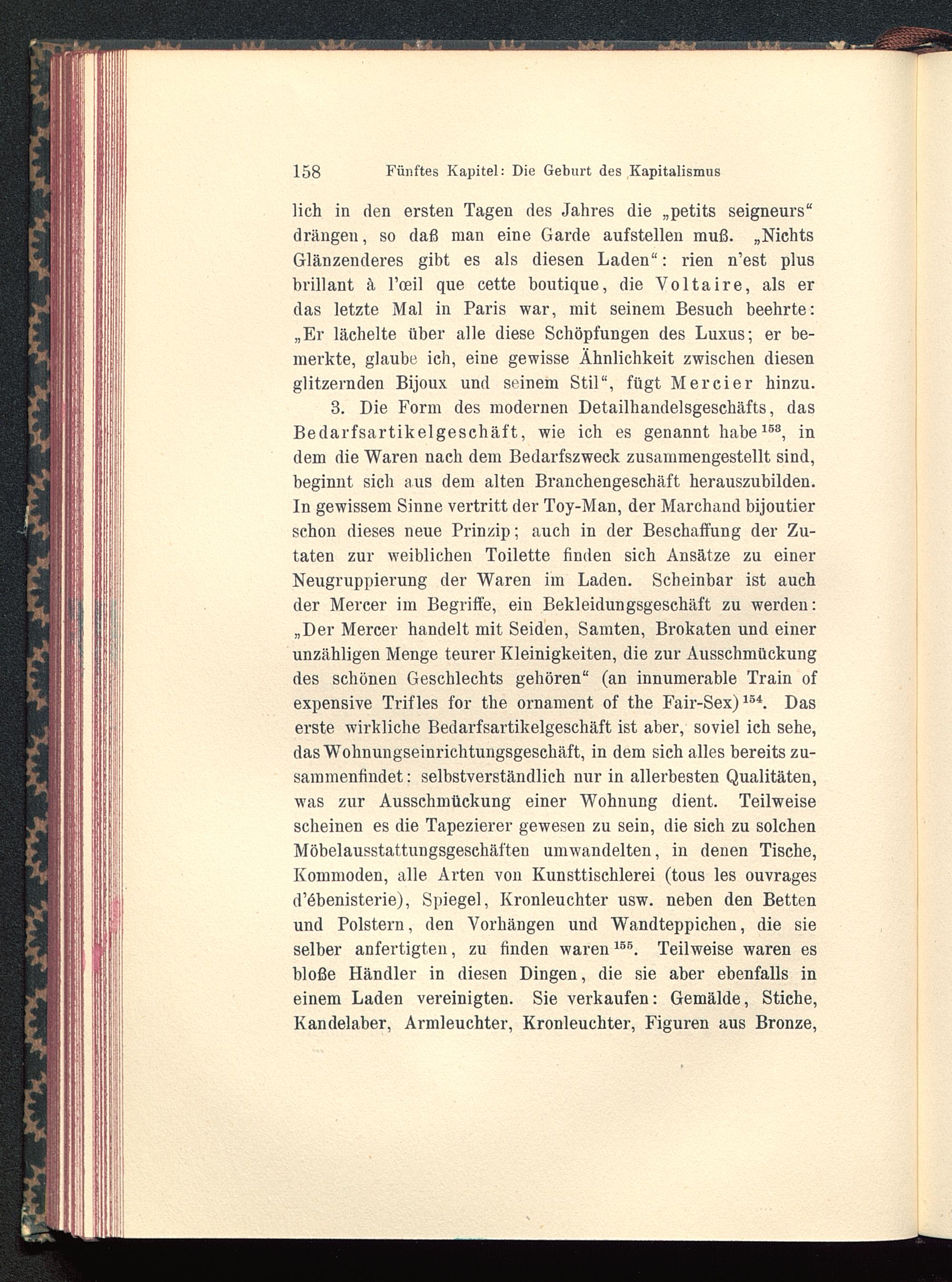 lieh in den ersten Tagen des Jahres die „petits seigneurs“drängen, so daß man eine Garde aufstellen muß. „NichtsGlänzenderes gibt es als diesen Laden“: rien n’est plusbrillant ä l’oeil que cette boutique, die Voltaire , als erdas letzte Mal in Paris war, mit seinem Besuch beehrte:„Er lächelte über alle diese Schöpfungen des Luxus; er be-merkte, glaube ich, eine gewisse Ähnlichkeit zwischen diesenglitzernden Bijoux und seinem Stil“, fügt Mercier hinzu.