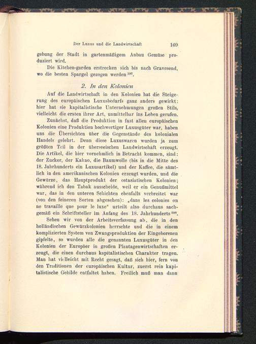 Zunächst, daß die Produktion in fast allen europäischenKolonien eine Produktion hochwertiger Luxusgüter war, habenuns die Übersichten über die Gegenstände des kolonialenHandels gelehrt. Denn diese Luxuswaren wurden ja zumgrößten Teil in der überseeischen Landwirtschaft erzeugt.Die Artikel, die hier vornehmlich in Betracht kommen, sind:der Zucker, der Kakao, die Baumwolle (bis in die Mitte des18. Jahrhunderts ein Luxusartikel) und der Kaffee, die sämt-lich in den amerikanischen Kolonien erzeugt wurden, und dieGewürze, das Hauptprodukt der ostasiatischen Kolonien;während ich den Tabak ausscheide, weil er ein Genußmittelwar, das in den unteren Schichten ebenfalls verbreitet war(von den feineren Sorten abgesehen): „dans les colonies onne travaille que pour le luxe“ urteilt also durchaus sach-gemäß ein Schriftsteller im Anfang des 18. Jahrhunderts 198 .