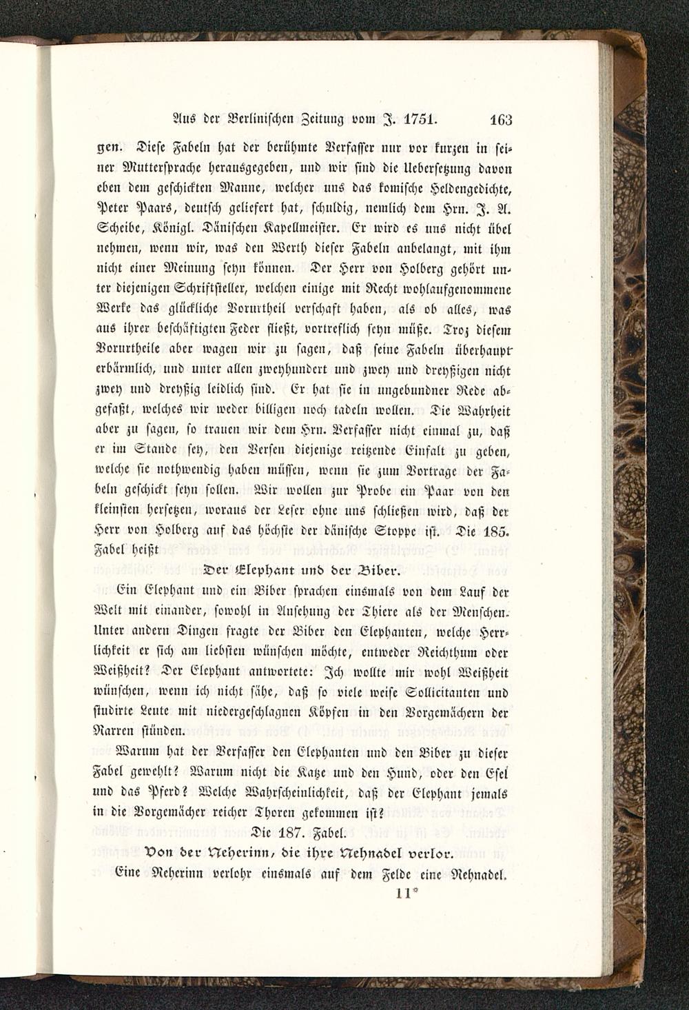 gen. Diese Fabeln hat der berühmte Verfasser mir vor kurzen in sei-ner Muttersprache herausgegeben, und wir sind die Ucbcrsctznng davoneben dem geschickten Manne, welcher uns das komische Heldengedichte,Peter Paars, deutsch geliefert hat, schuldig, neinlich dem Hrn. I. A.Scheibe, Königl. Dänischen Kapellmeister. Er wird es uns nicht übelnehmen, wenn wir, was den Werth dieser Fabeln anbelangt, mit ihmnicht einer Meinung seyn können. Tcr Herr von Holberg gehört un->tcr diejenigen Schriftsteller, weichen einige mit Recht wohlaufgcnommcncWerke das glückliche Vormthcil vcrschaft haben, als ob alles, wasaus ihrer beschäftigten Feder fließt, vortrcflich scyn müßc. Troz diesemVornrthcile aber wagen wir zu sagen, daß seine Fabeln nbcrhauprerbärmlich, und unter allen zwcyhundcrt und zwey und dreysiigcn nichtzwey und dreyßig leidlich sind. Er hat sie in ungcbundncr Rede ab-gefaßt, welches wir weder billigen noch tadeln wollen. Die Wahrheitaber zu sagen, so tränen wir dem Hrn. Verfasser nicht einmal zu, daßer im Stande sey, den Versen diejenige rcitzcndc Einfalt zu geben,welche sie nothwendig haben müssen, wenn sie zum Vortrage der Fa-beln geschickt seyn sollen. Wir wollen zur Probe ein Paar von denkleinsten hersetzen, woraus der Leser ohne uns schließen wird, daß derHerr von Holbcrg auf das höchste der dänische Stoppe ist. Die 185.Fabel heißt
