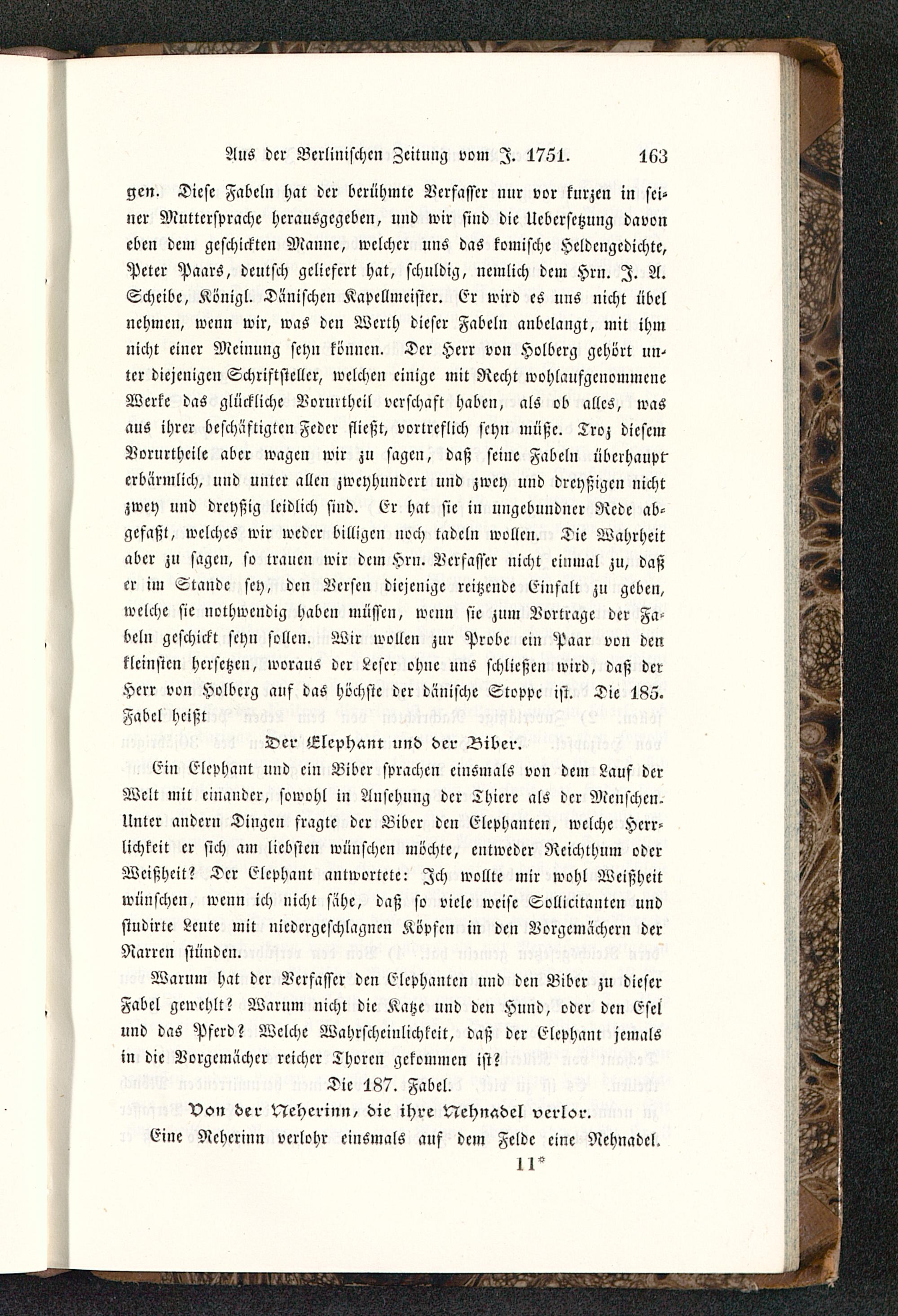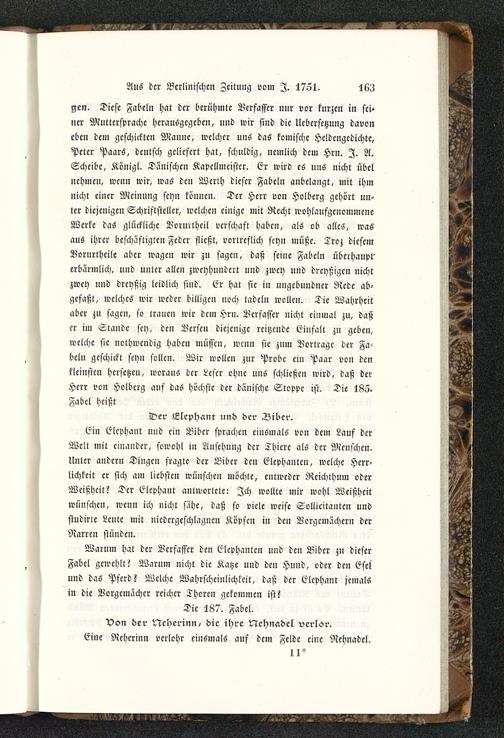 Warum hat der Verfasser den Elephanten und den Biber zu dieserFabel gcwchlt? Warum nicht die Katze und den Hnnd, oder den Eselund das Pferd? Welche Wahrscheinlichkeit, daß der Elephant jemalsin die Norgcmächcr reicher Thoren gekommen istsDie 187. Fabel.Von der Neherinil/ die ihre Nehnadcl verlor.Eine Nchcrinn vcrlohr einsmals ans dem Felde eine Nchnadcl.