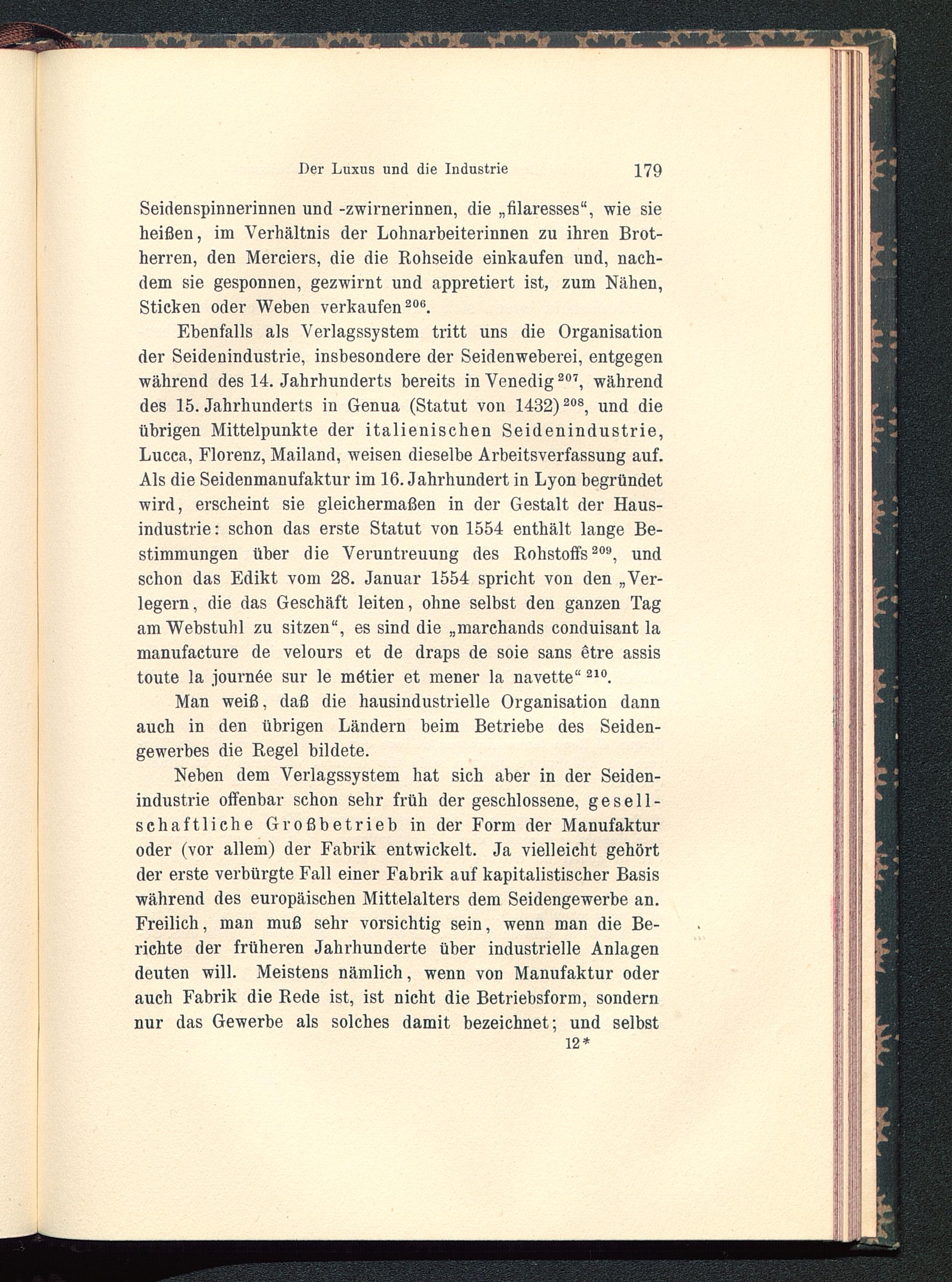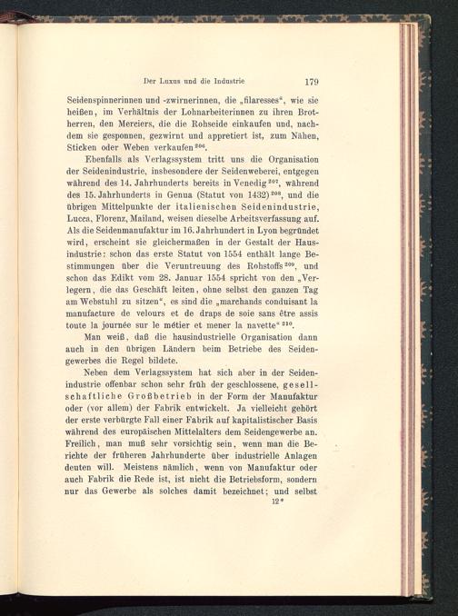 Ebenfalls als Verlagssystem tritt uns die Organisationder Seidenindustrie, insbesondere der Seidenweberei, entgegenwährend des 14. Jahrhunderts bereits in Venedig 207 , währenddes 15. Jahrhunderts in Genua (Statut von 1432) 208 , und dieübrigen Mittelpunkte der italienischen Seidenindustrie,Lucca, Florenz, Mailand , weisen dieselbe Arbeitsverfassung auf.Als die Seidenmanufaktur im 16. Jahrhundert in Lyon begründetwird, erscheint sie gleichermaßen in der Gestalt der Haus-industrie : schon das erste Statut von 1554 enthält lange Be-stimmungen über die Veruntreuung des Rohstoffs 209 , undschon das Edikt vom 28. Januar 1554 spricht von den „Ver-legern, die das Geschäft leiten, ohne selbst den ganzen Tagam Webstuhl zu sitzen“, es sind die „marchands conduisant lamanufacture de velours et de draps de soie sans etre assistoute la journöe sur le mötier et mener la navette“ 210 .