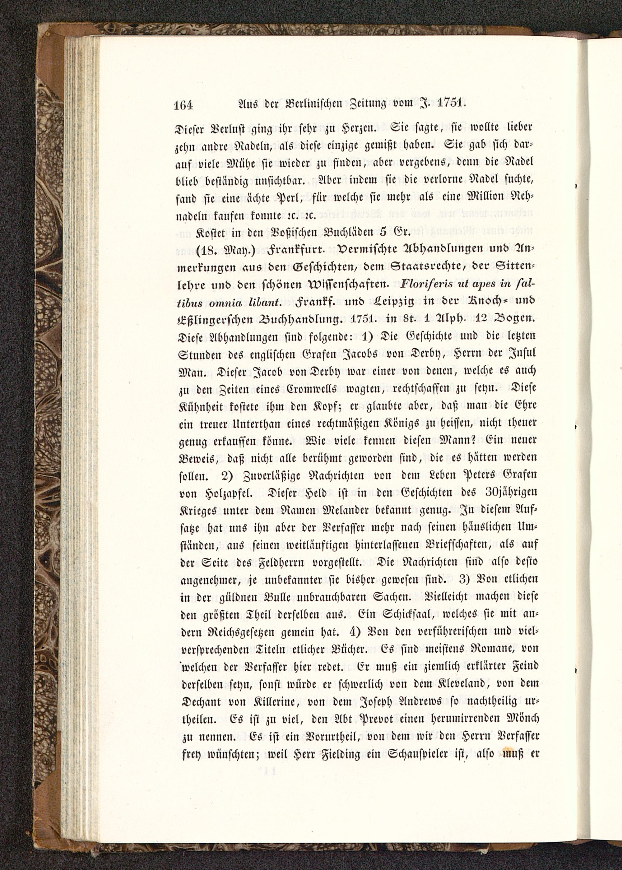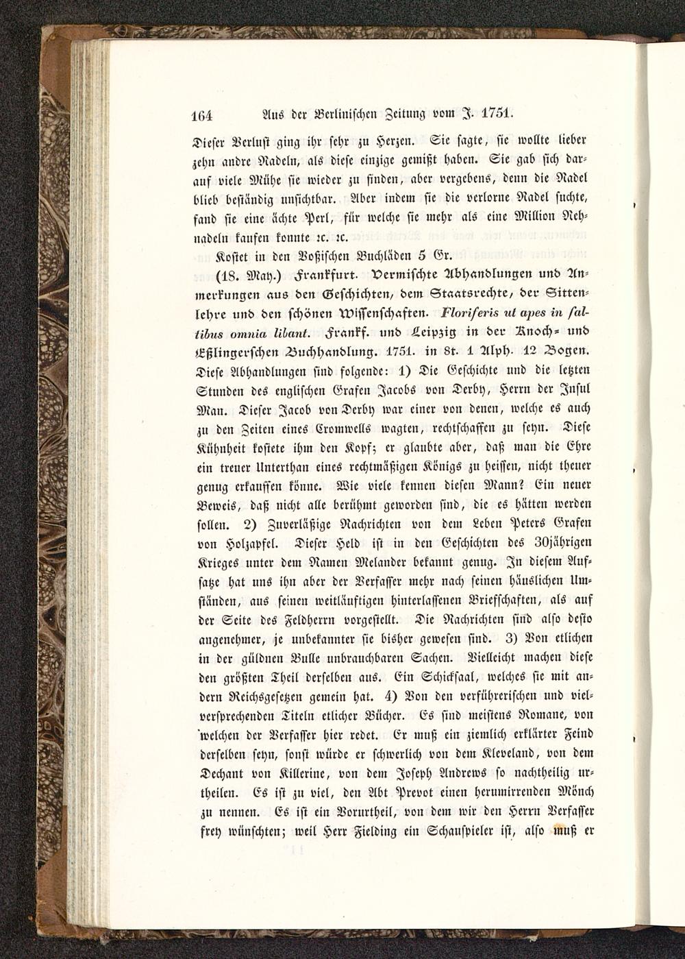 onitti« itbltti/. Franks, und Leipzig in dcr Rnoch- und»Lßlingcrschcn Buchhandlung. 1761. in 8t. 1 Alph. 12 Bogen.Diese Abhandlungen sind folgende: 1) Die Geschichte und die letztenStunden des englischen Grafen Jacobs von Derby, Herrn der JnsnlMan. Dieser Jacob von Derby war einer von denen, welche es auchzu den Zeiten eines Cromwclls wagten, rechtschaffen zu seyn. DieseKühnheit kostete ihm den Kopf; er glaubte aber, daß man die Ehreein treuer Unterthan eines rechtmäßigen Königs zu heisscn, nicht theuergenug crkauffen könne. Wie viele kennen diesen Mann? Ein neuerBeweis, daß nicht alle berühmt geworden sind, die eS hätten werdensollen. 2) Zuverläßigc Nachrichten von dem Leben Peters Grafenvon Holzapfel. Dieser Held ist in den Geschichten des ZiZjährigcnKrieges unter dem Namen Mclandcr bekannt genug. In diesem Auf-sätze hat uns ihn aber der Verfasser mehr nach seinen häuslichen Um-ständen, aus seinen weitläuftigcn hinterlassenen Briefschaften, als aufdcr Seite des Feldherrn vorgestellt. Die Nachrichten sind also destoangenehmer, je unbekannter sie bisher gewesen sind. 3) Von etlichenin dcr güldncn Bulle unbrauchbaren Sachen. Vielleicht machen dieseden größten Theil derselben ans. Ein Schicksaal, welches sie mit an-dern Rcichsgcsetzen gemein hat. 4) Von den verführerischen und viel-versprechenden Titeln etlicher Bücher. Es sind meistens Romane, vonwelchen dcr Verfasser hier redet. Er muß ein ziemlich erklärter Feindderselben seyn, sonst würde er schwerlich von dem Klcveland, von demDechant von Killcrine, von dem Joseph Andrews so nachthcilig ur-theilen. Es ist zn viel, den Abt Prevot einen hcrumirrenden Mönchzu nennen. Es ist ein Vorurthcil, von dem wir den Herrn Verfasserfrey wünschten; weil Herr Fielding ein Schauspieler ist, also muß er