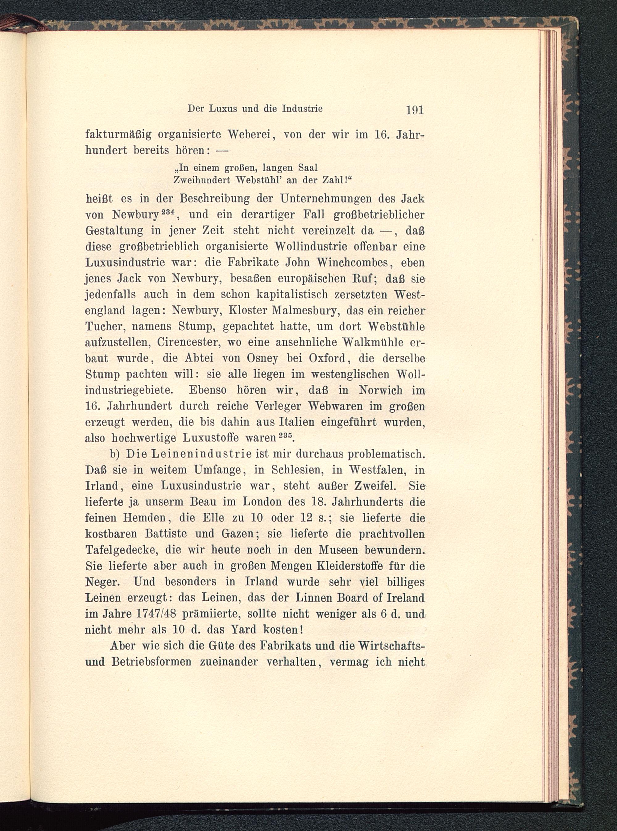 heißt es in der Beschreibung der Unternehmungen des Jackvon Newbury 284 , und ein derartiger Fall großbetrieblicherGestaltung in jener Zeit steht nicht vereinzelt da —, daßdiese großbetrieblich organisierte Wollindustrie offenbar eineLuxusindustrie war: die Fabrikate John Winehcombes, ebenjenes Jack von Newbury, besaßen europäischen Ruf; daß siejedenfalls auch in dem schon kapitalistisch zersetzten West-england lagen: Newbury, Kloster Malmesbury, das ein reicherTücher, namens Stump, gepachtet hatte, um dort Webstiihleaufzustellen, Cirencester, wo eine ansehnliche Walkmühle er-baut wurde, die Abtei von Osney bei Oxford, die derselbeStump pachten will: sie alle liegen im westenglischen Woll-industriegebiete. Ebenso hören wir, daß in Norwich im16. Jahrhundert durch reiche Verleger Webwaren im großenerzeugt werden, die bis dahin aus Italien eingeführt wurden,also hochwertige Luxustoffe waren 236 .