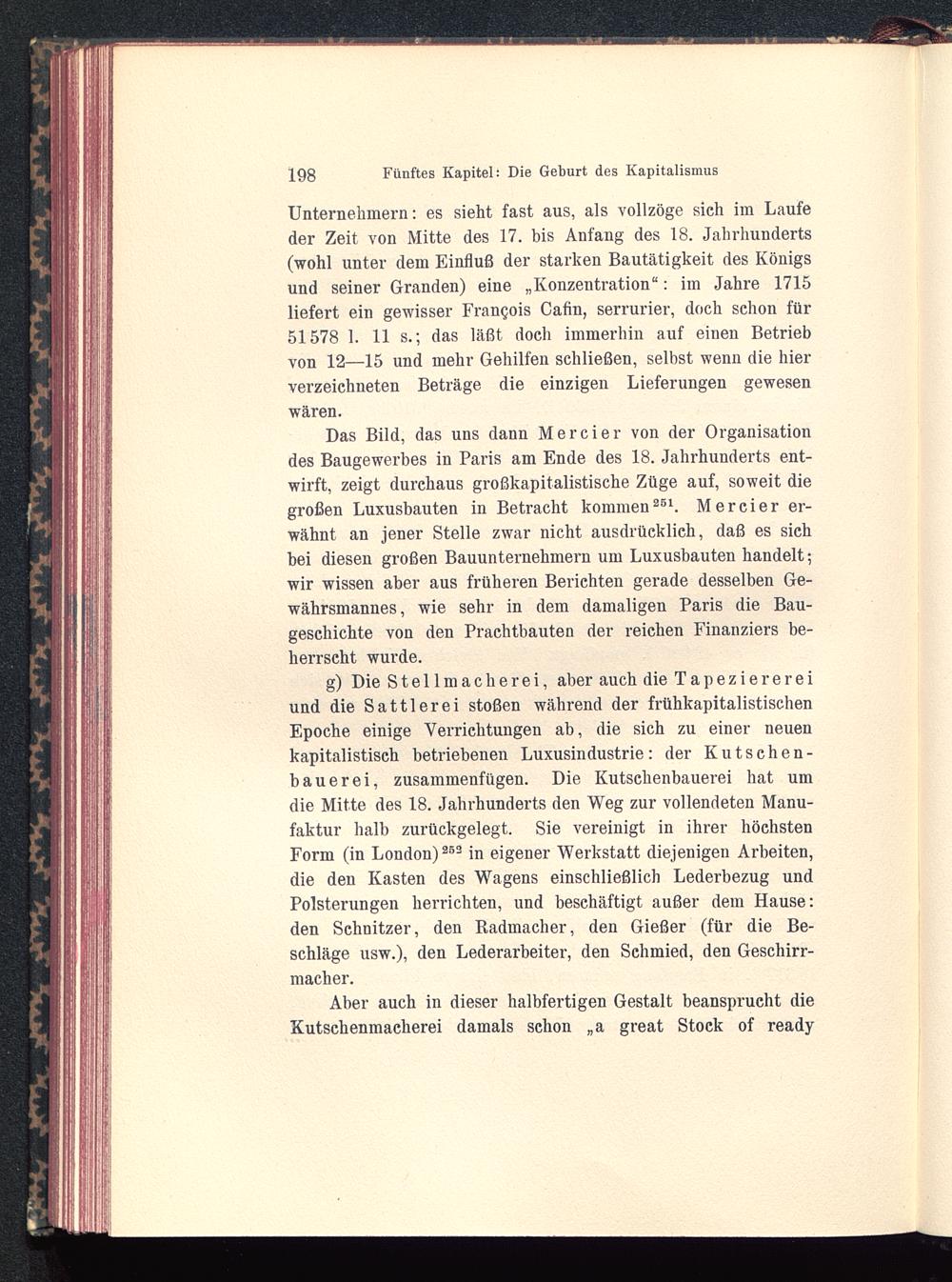 Das Bild, das uns dann Mercier von der Organisationdes Baugewerbes in Paris am Ende des 18. Jahrhunderts ent-wirft, zeigt durchaus großkapitalistische Züge auf, soweit diegroßen Luxushauten in Betracht kommen 261 . Mercier er-wähnt an jener Stelle zwar nicht ausdrücklich, daß es sichbei diesen großen Bauunternehmern um Luxusbauten handelt;wir wissen aber aus früheren Berichten gerade desselben Ge-währsmannes, wie sehr in dem damaligen Paris die Bau-geschichte von den Prachtbauten der reichen Finanziers be-herrscht wurde.