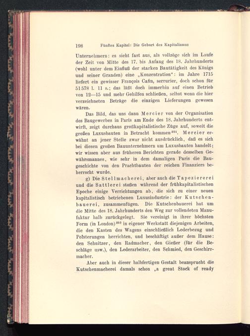g) Die Stellmacherei, aber auch die Tapezierereiund die Sattlerei stoßen während der frühkapitalistischenEpoche einige Verrichtungen ab, die sich zu einer neuenkapitalistisch betriebenen Luxusindustrie: der Kutschen-bau er ei, zusammenfügen. Die Kutschenbauerei hat umdie Mitte des 18. Jahrhunderts den Weg zur vollendeten Manu-faktur halb zurückgelegt. Sie vereinigt in ihrer höchstenForm (in London ) 263 in eigener Werkstatt diejenigen Arbeiten,die den Kasten des Wagens einschließlich Lederbezug undPolsterungen herrichten, und beschäftigt außer dem Hause:den Schnitzer, den Radmacher, den Gießer (für die Be-schläge usw.), den Lederarbeiter, den Schmied, den Geschirr-macher.