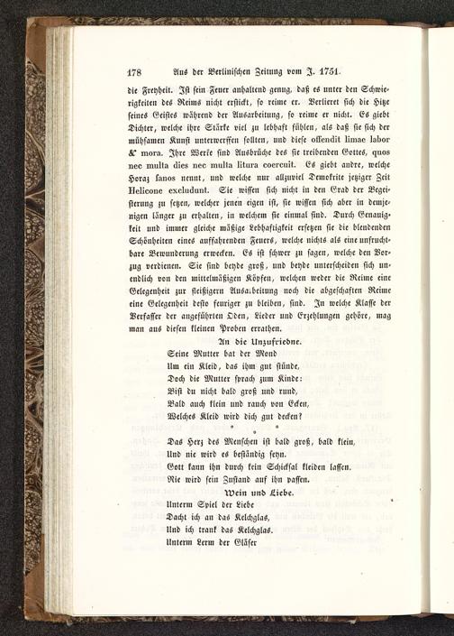 Das Herz des Menschen ist bald groß, bald klein,Und nie wird es beständig seyn.Gott kann ihn durch kein Schicksal kleiden lassen.Nie wird sein Znstand auf ihn passen.
