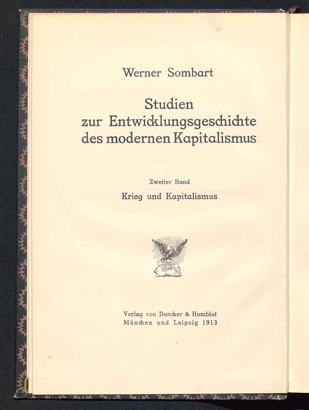 Werner Sombart Studienzur Entwicklungsgeschichtedes modernen KapitalismusZweiter BandKrieg und KapitalismusiVincJt,'Verilas/«fein,Verlag von Dundker & Humblot