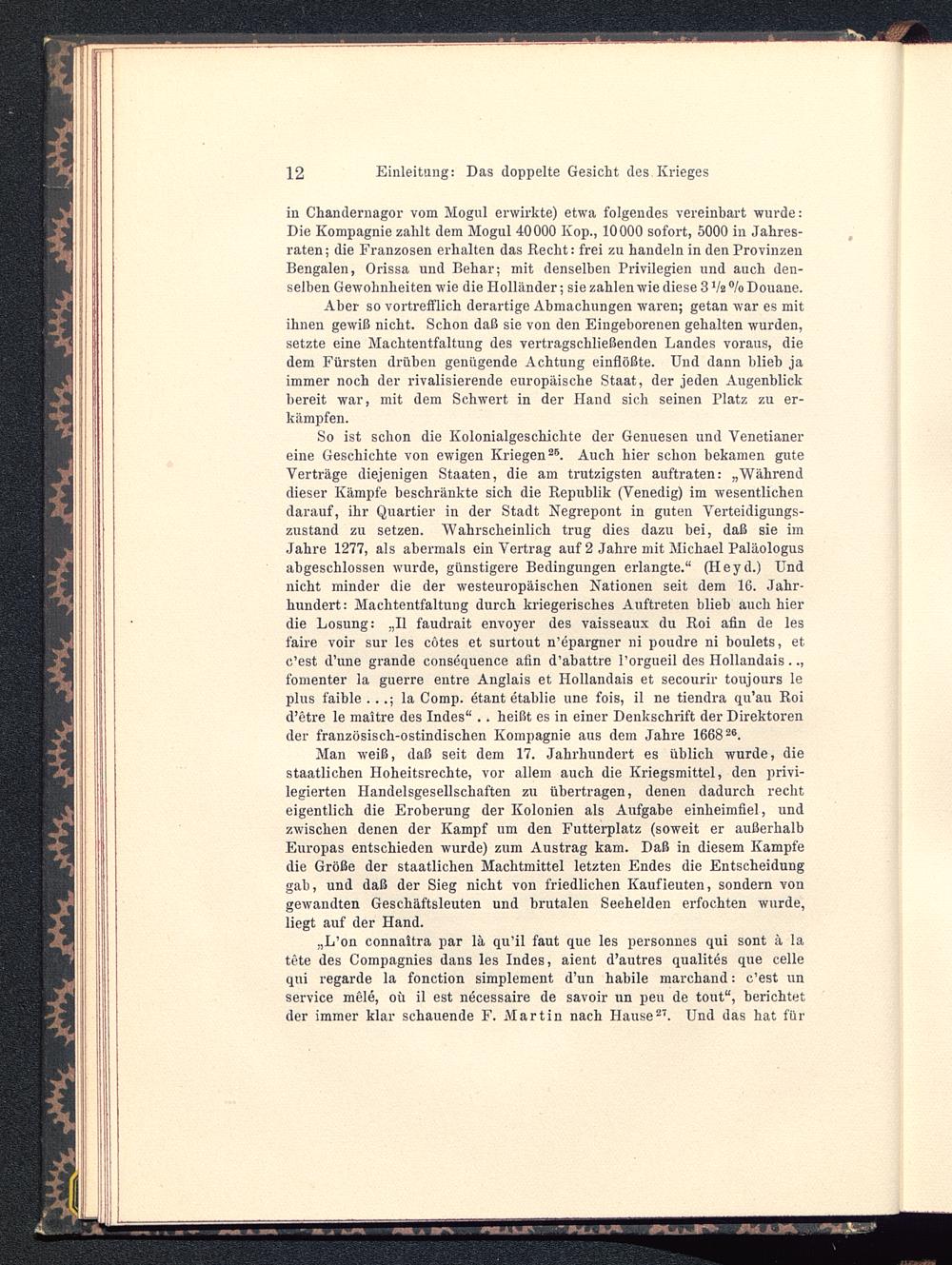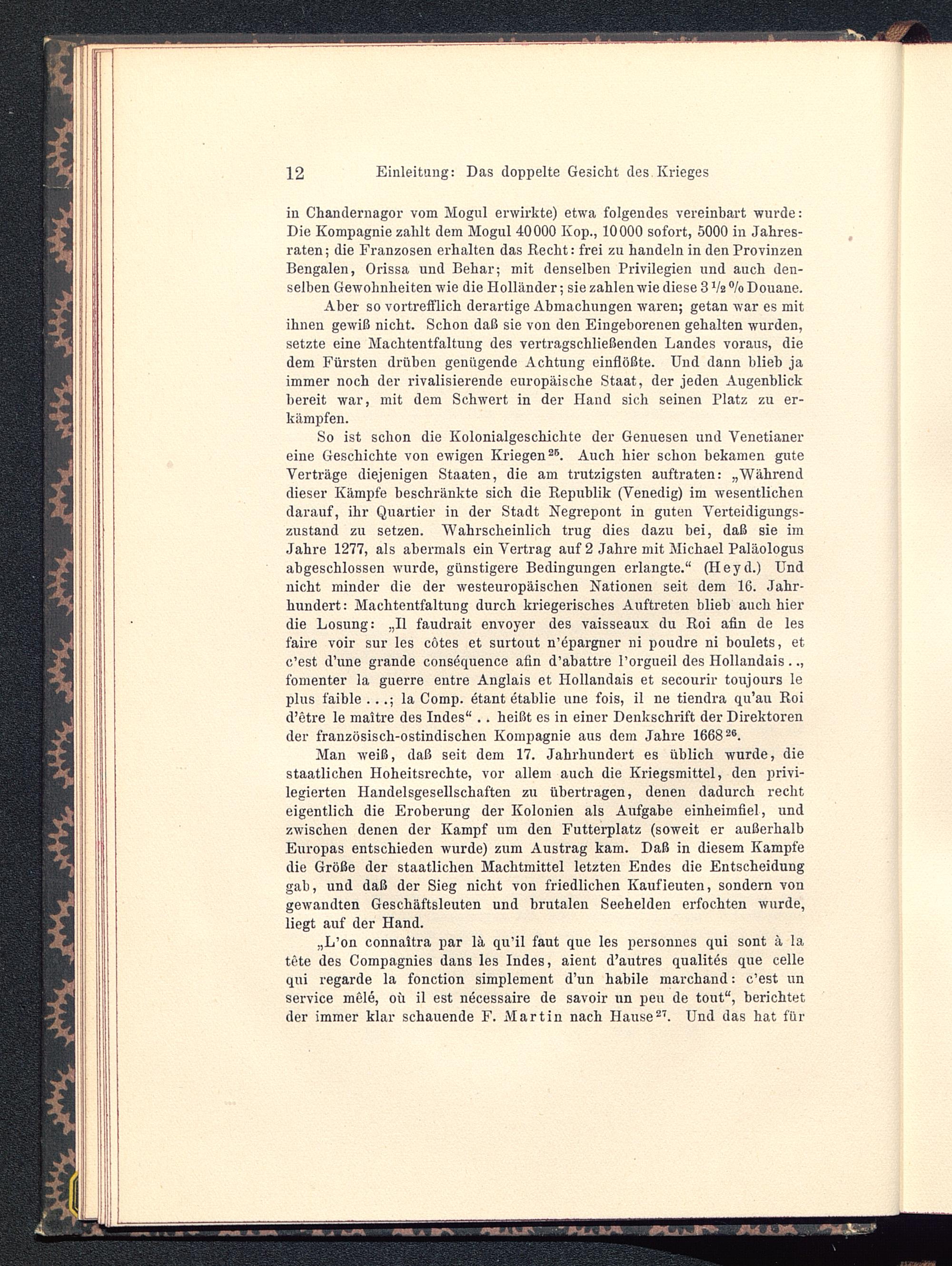 So ist schon die Kolonialgeschichte der Genuesen und Venetianereine Geschichte von ewigen Kriegen 26 . Auch hier schon bekamen guteVerträge diejenigen Staaten, die am trutzigsten auftraten: „Währenddieser Kämpfe beschränkte sich die Republik (Venedig) im wesentlichendarauf, ihr Quartier in der Stadt Negrepont in guten Verteidigungs-zustand zu setzen. Wahrscheinlich trug dies dazu bei, daß sie imJahre 1277, als abermals ein Vertrag auf 2 Jahre mit Michael Paläologus abgeschlossen wurde, günstigere Bedingungen erlangte.“ (Heyd.) Undnicht minder die der westeuropäischen Nationen seit dem 16. Jahr-hundert : Machtentfaltung durch kriegerisches Auftreten blieb auch hierdie Losung: „II faudrait envoyer des vaisseaux du Roi afin de lesfaire voir sur les cötes et surtout n’epargner ni poudre ni boulets, etc’est d’une grande consequence afin d’abattre l’orgueil des Hollandais ..,fomenter la guerre entre Anglais et Hollandais et secourir toujours leplus faible ...; la Comp, etant etablie une fois, il ne tiendra qu’au Roid’etre le maitre des Indes“ . . heißt es in einer Denkschrift der Direktorender französisch-ostindischen Kompagnie aus dem Jahre 1668 26 .