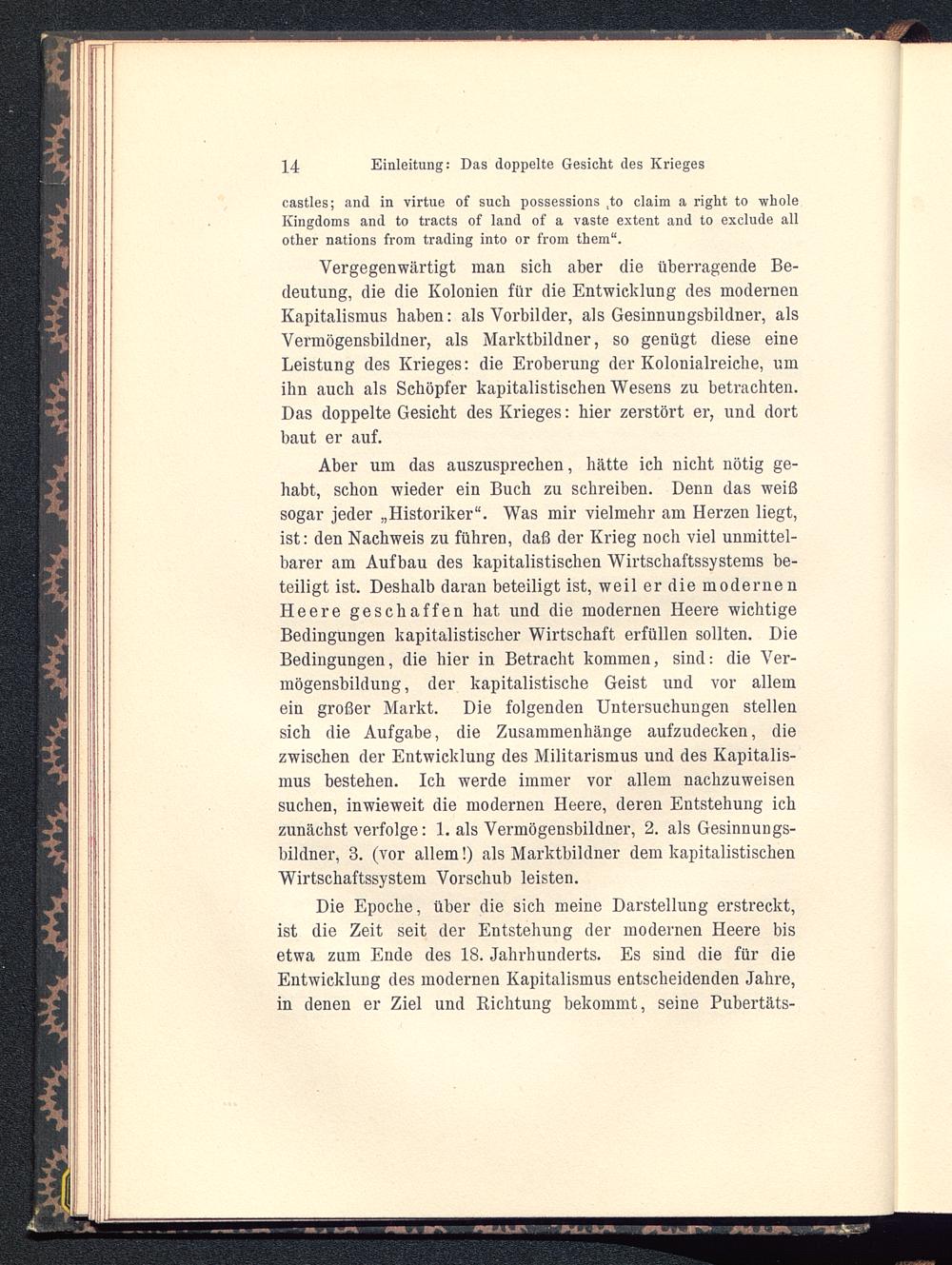 Aber um das auszusprechen, hätte ich nicht nötig ge-habt, schon wieder ein Buch zu schreiben. Denn das weißsogar jeder „Historiker“. Was mir vielmehr am Herzen liegt,ist: den Nachweis zu führen, daß der Krieg noch viel unmittel-barer am Aufbau des kapitalistischen Wirtschaftssystems be-teiligt ist. Deshalb daran beteiligt ist, weil er die modernenHeere geschaffen hat und die modernen Heere wichtigeBedingungen kapitalistischer Wirtschaft erfüllen sollten. DieBedingungen, die hier in Betracht kommen, sind: die Ver-mögensbildung, der kapitalistische Geist und vor allemein großer Markt. Die folgenden Untersuchungen stellensich die Aufgabe, die Zusammenhänge aufzudecken, diezwischen der Entwicklung des Militarismus und des Kapitalis-mus bestehen. Ich werde immer vor allem nachzuweisensuchen, inwieweit die modernen Heere, deren Entstehung ichzunächst verfolge: 1. als Vermögensbildner, 2. als Gesinnungs-bildner, 3. (vor allem!) als Marktbildner dem kapitalistischen Wirtschaftssystem Vorschub leisten.