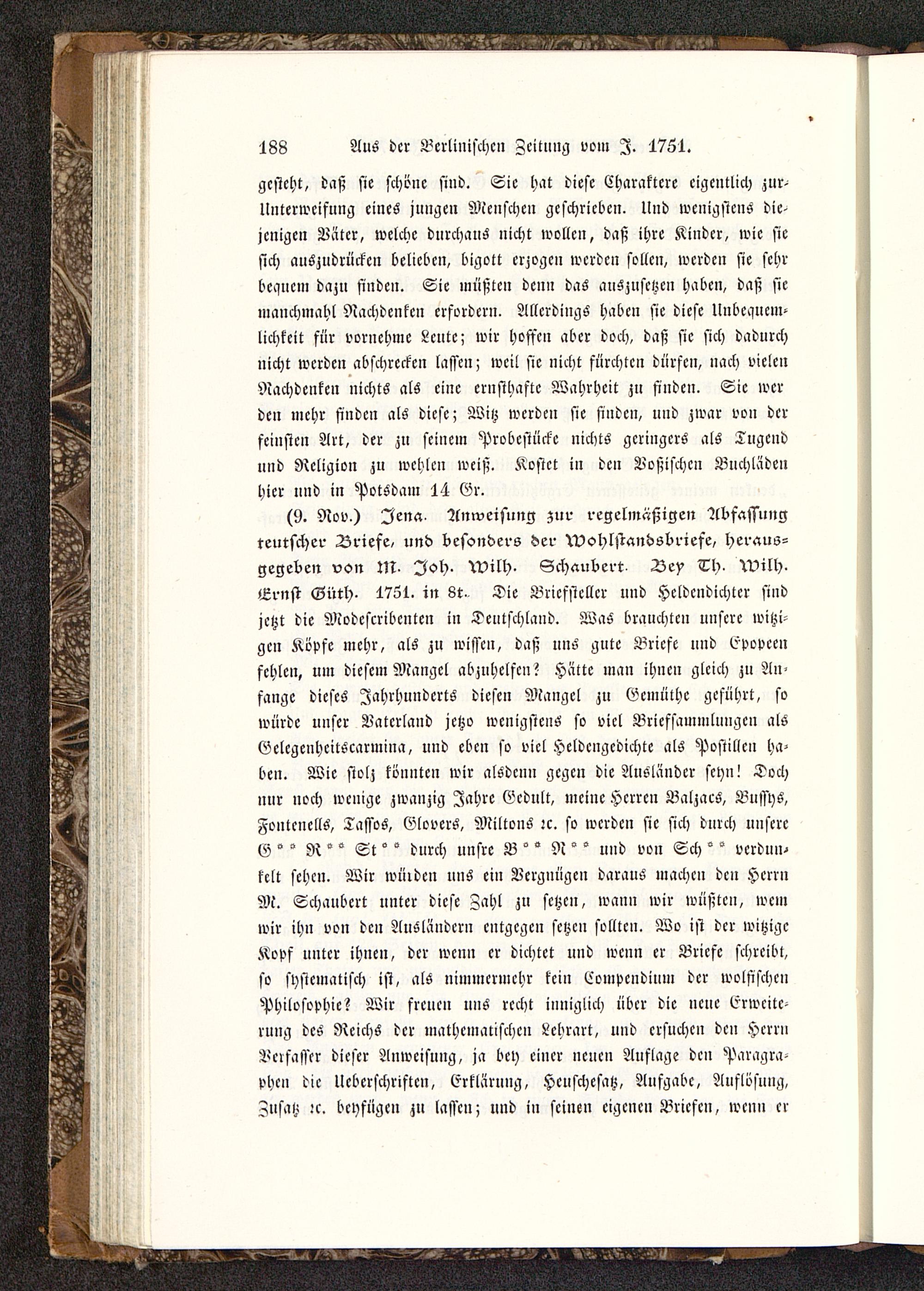 (9. Nov.) Jena. Anweisung zur regelmäßigen Abfassungteutscher Briefe, und besonders der Wohlstandsbriefe, heraus-gegeben von M. Joh. Will). Schaubert Bey Th . Will).Ernst Güth. 1751. in 8t. Die Briefsteller nnd Hcldcndichtcr sindjetzt die Modcscrihcntcn in Deutschland . Was brauchten unsere witzi-gen Köpfe mehr, als zu wissen, daß uns gute Briefe und Epopccnfehlen, um diefem Mangel abzuhelfen? Hätte man ihnen gleich zu An-fange dieses Jahrhunderts diesen Mangel zu Gemüthe geführt, sowürde unser Vaterland jctzo wenigstens so viel Briefsammlungcn alsGclcgcnhcitscarmina, und eben fo viel Heldengedichte als Postillcn ha-ben. Wie stolz könnten wir alSdcun gegen die Ausländer seyn! Tochnur noch wenige zwanzig Jahre Gcdult, meine Herren Balzacs, Bussys,Fontcnclls, Tassos, GloverS, MiltonS:c. so wcrdcn sie sich durch unsereG ° ° R ° ° St ° ° durch unsre B ° ° N ° ° und von Sch ° ° verdun-kelt sehen. Wir würden nns ein Vergnügen daraus machen den HerrnM. Schaubcrt unter diese Zahl zu setzen, wann wir wüßten, wemwir ihn von dcn Ausländern entgegen setzen solltcn. Wo ist dcr witzigcKopf unter ihnen, dcr wenn er dichtet und wenn er Briefe schreibt,so systematisch ist, als nimmermehr kein Compcndium dcr wölfischenPhilosophie? Wir freuen uns recht inniglich über die ncne Erweite-rung des Reichs der »lathcmalischcn Lchrart, und crsuchc» dcn HcrrnVerfasser dieser Anweisung, ja bey einer neuen Auflage dcn Paragra-phcn die lleberschriftcn, Erklärung, Hcuschcsatz, Aufgahc, Auflösung,Znsatz :c. bcyfügcn zu lassen; und in seinen eigenen Briefen, wen» er