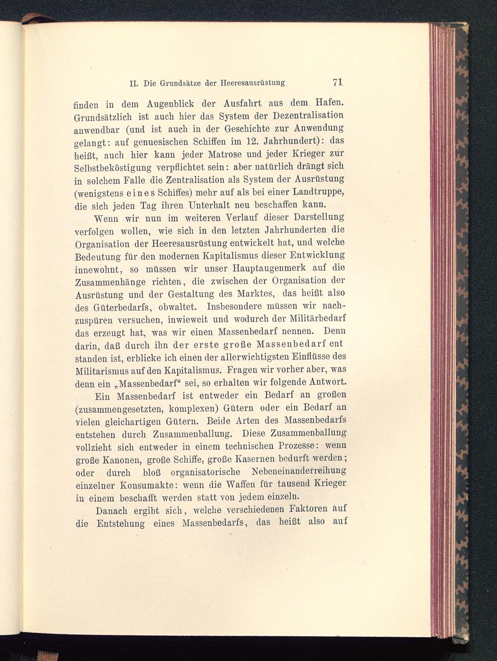 Ein Massenbedarf ist entweder ein Bedarf an großen(zusammengesetzten, komplexen) Gütern oder ein Bedarf anvielen gleichartigen Gütern. Beide Arten des Massenbedarfsentstehen durch Zusammenballung. Diese Zusammenballungvollzieht sieh entweder in einem technischen Prozesse: wenngroße Kanonen, große Schiffe, große Kasernen bedurft werden;oder durch bloß organisatorische Nebeneinanderreihungeinzelner Konsumakte: wenn die Waffen für tausend Kriegerin einem beschafft werden statt von jedem einzeln.