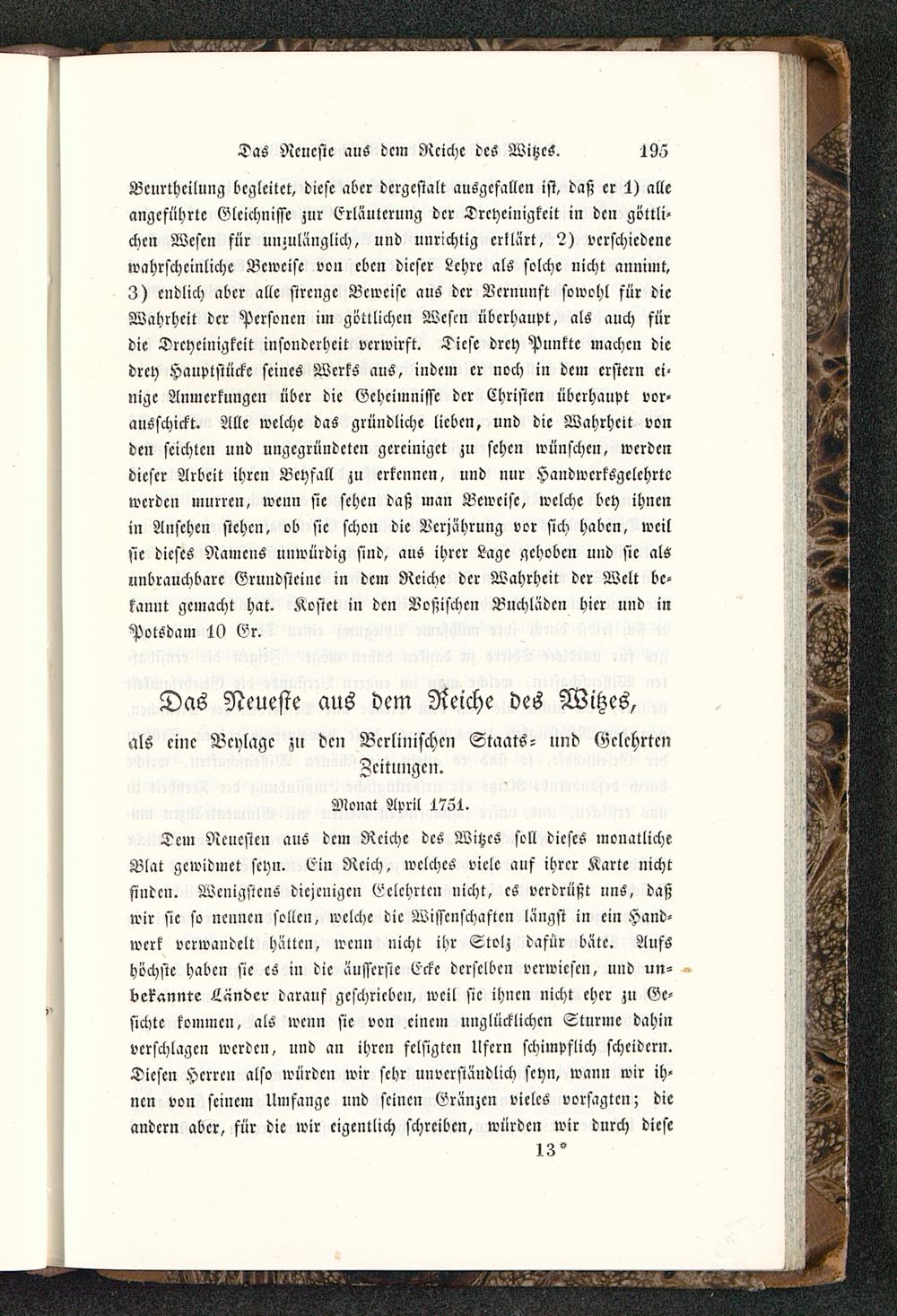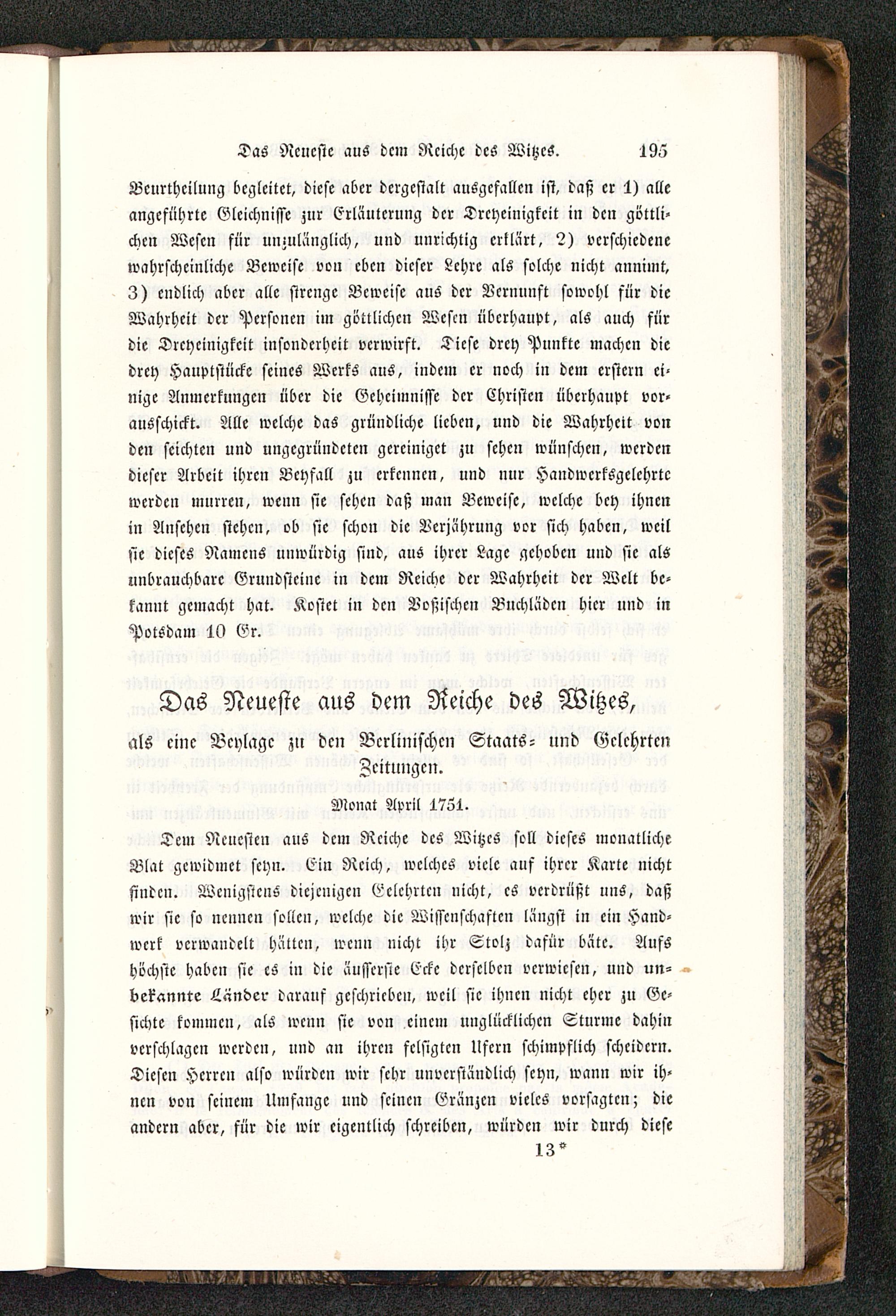 Dem Neuesten aus dem Rcichc des WitzcS soll dieses monatlicheBlat gewidmet seyn. Ein Reich, welches viele auf ihrer Karte nichtfinden. Wenigstens diejenigen Gelehrten nicht, es vcrdrüßt nnS, daßwir sie so nennen sollen, welche die Wissenschaften längst in ein Hand-werk verwandelt hätten, wenn nicht ihr Stolz dafür bäte. Anfshöchste haben sie cS in die äusserste Ecke derselben verwiesen, und un-bekannte Länder darauf geschrieben, weil sie ihnen nicht eher zu Ge-sichte kommen, als wenn sie von einem unglücklichen Sturme dahinverschlagen werten, und an ihren fclsigtcn Ufern schimpflich schcidcrn.Diesen Herren also würdcn wir sehr unvcrstäudlicl, seyn, wann wir ih-nen von seinem Umfange und scincn Gränzen vieles vorsagten; dieandern aber, für die wir eigentlich schreiben, würden wir durch diese