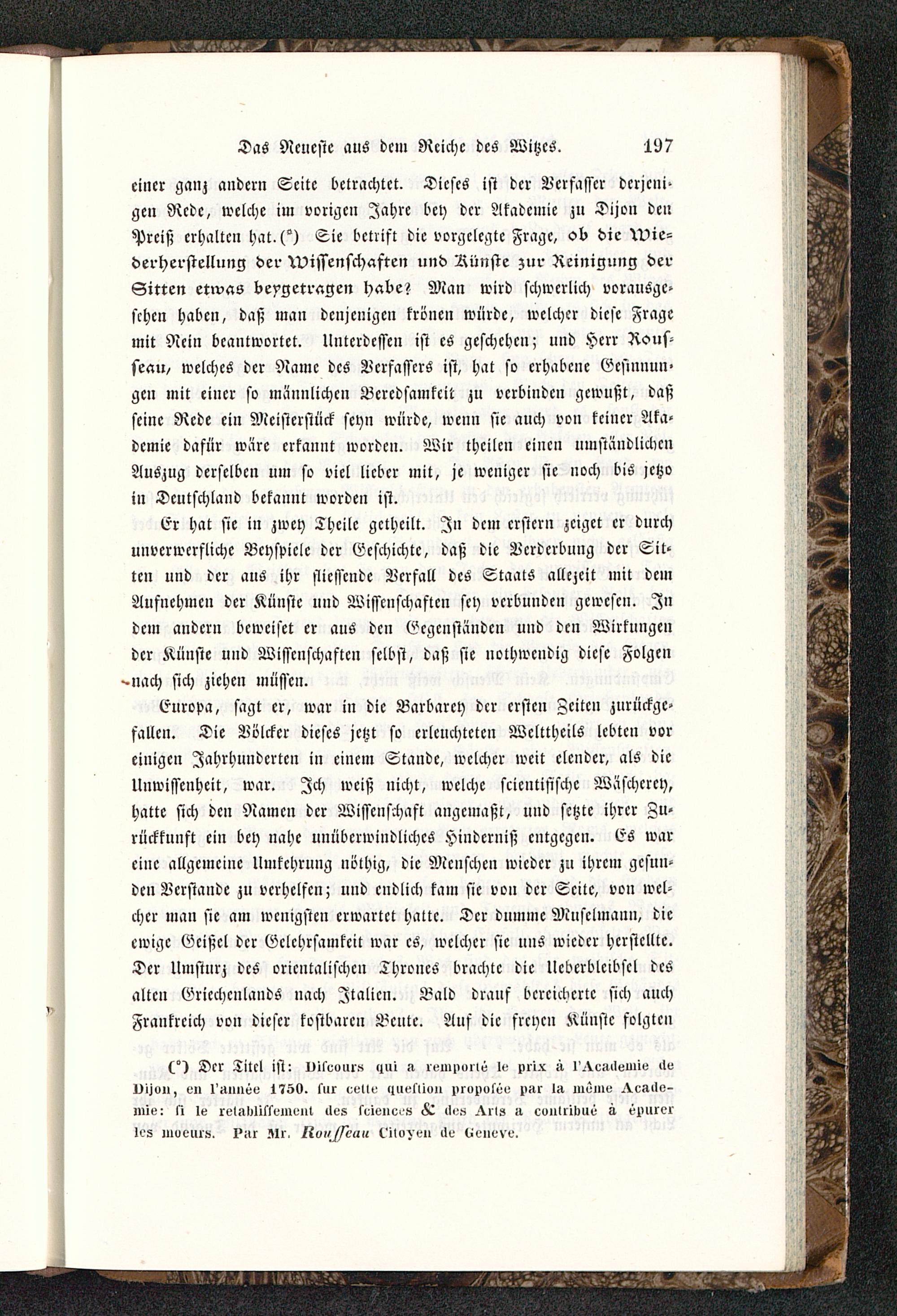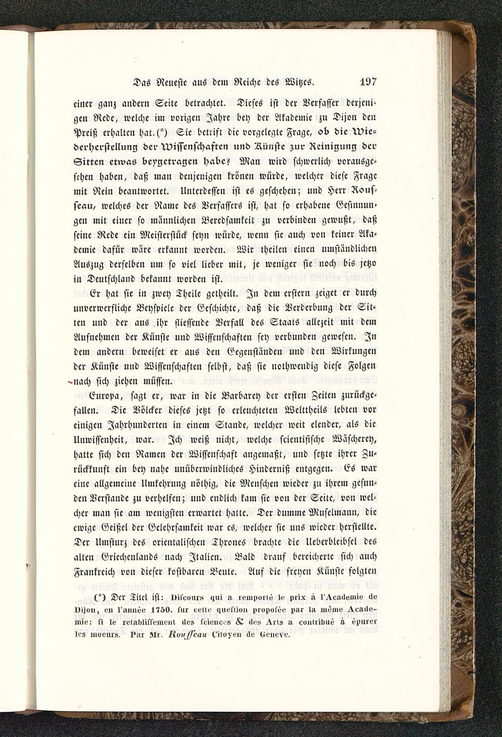 cincr ganz andern Seite betrachtet. Dieses ist der Verfasser dcrjcni-gen Rede, welche im vorigen Jahre bey der Akademie zu Dijon denPrciß erhalten hat.(°) Sie bctrifl die vorgelegte Frage, ob die Wie-derherstellung der Wissenschaften und Aiinste zur Reinigung derSitten etwas beygetragen habe? Man wird schwerlich vorausge-sehen haben, daß man denjenigen kröne» würde, welcher diese Fragemit Nein beantwortet. Unterdessen ist es geschehen; und Herr Rous-seau / welches der Name des Verfassers ist, hat so erhabene Gesinnun-gen mit cincr so männlichen Beredsamkeit zu verbinden gewußt, daßscinc Rede ein Meisterstück seyn würde, wenn sie auch von kciucr Aka-demie dafür wäre erkannt worden. Wir theilen einen umständlichenAuszug derselben um so viel lieber mit, je weniger sie noch bis >ctzoin Deutschland bekannt worden ist.