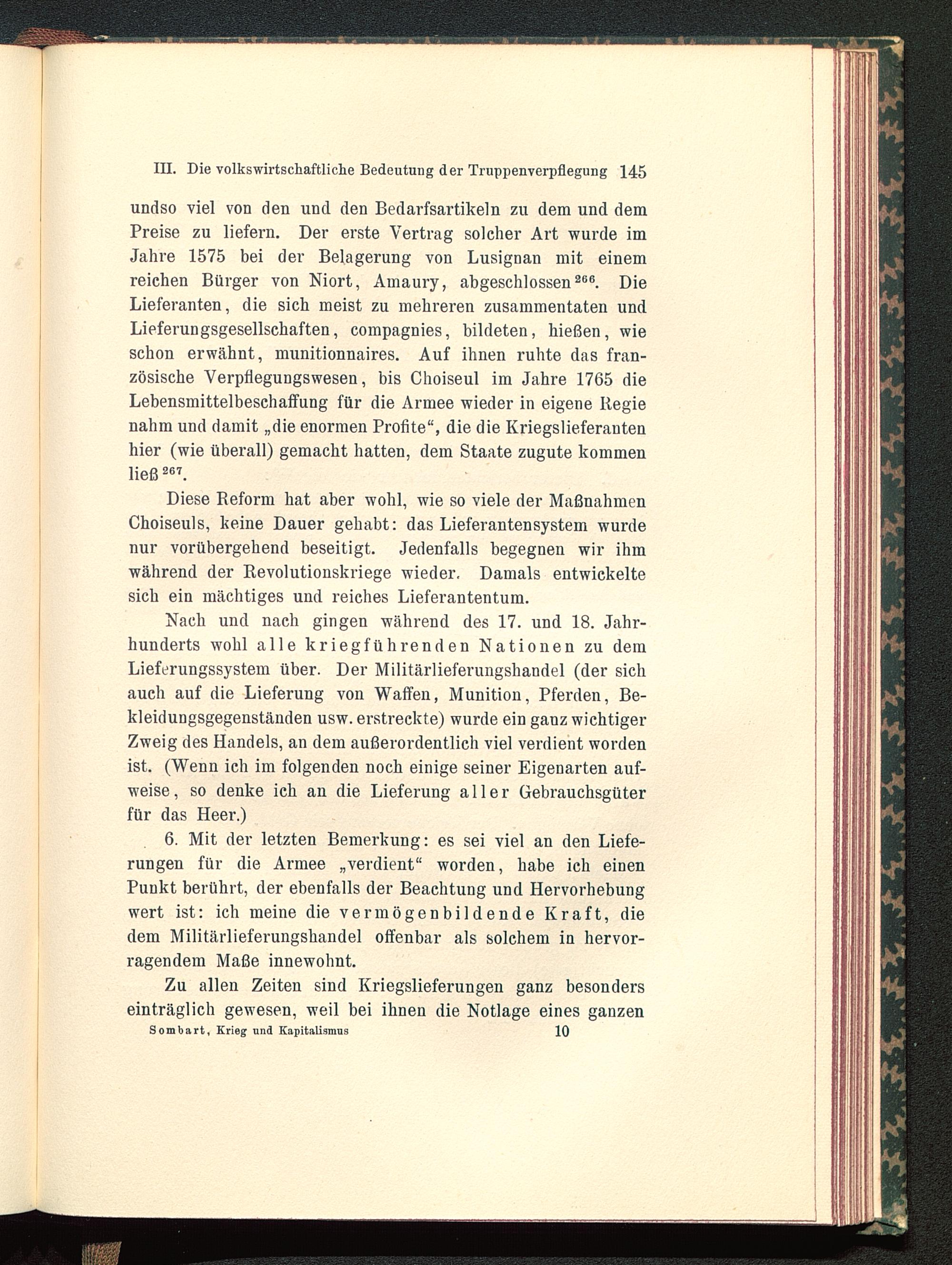 undso viel von den und den Bedarfsartikeln zu dem und demPreise zu liefern. Der erste Vertrag solcher Art wurde imJahre 1575 bei der Belagerung von Lusignan mit einemreichen Bürger von Niort , Amaury, abgeschlossen 266 . DieLieferanten, die sich meist zu mehreren zusammentaten undLieferungsgesellschaften, compagnies, bildeten, hießen, wieschon erwähnt, munitionnaires. Auf ihnen ruhte das fran-zösische Verpfiegungswesen, bis Choiseul im Jahre 1765 dieLebensmittelbeschaffung für die Armee wieder in eigene Regienahm und damit „die enormen Profite“, die die Kriegslieferantenhier (wie überall) gemacht hatten, dem Staate zugute kommenließ 267 .
