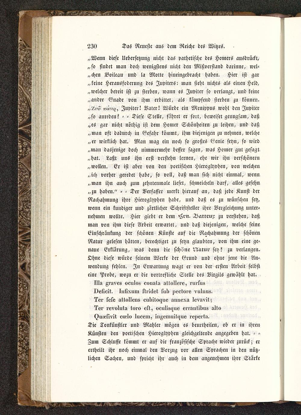 „Wenn diese Ilebcrsetzung nicht das pathetische des Homers ausdrückt,„so findet man doch wenigstens nicht den Mißverstand darinne, wcl-„chcn Voilccni und la Motte hineingebracht haben. Hier ist gar„keine HerauSfodcrnng des Jupiters: man sieht nichts als einen Held,„welcher bereit ist zu sterben, wann es Jupiter so verlangt, und keine„andre Gnade von ihm erbittet, als kämpfcnd sterben zu können.„X--6 7r«^, Jupiter! Vater! Wurde ein Mcnippus wohl den Jupiter„so anreden? - - Diese Stelle, fähret er fort, beweiset genugsam, daß„cS gar nicht nöthig ist dem Homer Schönheiten zu leihen, und daß„man oft dadurch in Gefahr kommt, ihm diejenigen zu nehmen, welche„er wirklich hat. Man mag ein noch so großes Genie seyn, so wird„man dasjenige doch uiminermehr besser sagen, was Homer gut gesagt„hat. Laßt uns ihn erst versteh» lernen, ehe wir ihn verschönern„wollen. Er ist aber von den poetischen Hieroglyphen, von welche»„ich vorher geredet habe, so voll, daß man sich nicht einmal, wenn„man ihn auch zum zehntcnmalc licsct, schmeicheln darf, alles gesehn„zu haben." - - Der Verfasser merkt hierauf an, daß jede Knnst derNachahmung ihre Hieroglyphen habe, und daß es zu wünschen sey,wenn ein kundiger und zärtlicher Schriftsteller ihre Vcrglcichung unter-nehmen wollte. Hier giebt er dem Hrn. Batreup zu verstehen, daßman von ihm diese Arbeit erwartet, und daß diejenigen, welche seineEinschränkung der schönen Künste auf die Nachahmung der schöne»Natur gelesen hätten, berechtiget zu seyn glaubten, von ihm eine ge-naue Erklärung, was denn die schöne Natur sey? zu verlangen.Ohne diese würde seinem Werke der Grund und ohne jene die An-wendung fehlen. In Erwartung wagt er von der ersten Arbeit selbsteine Probe, wozu er die vortrcfliche Stelle des Virgils gewählt hat.