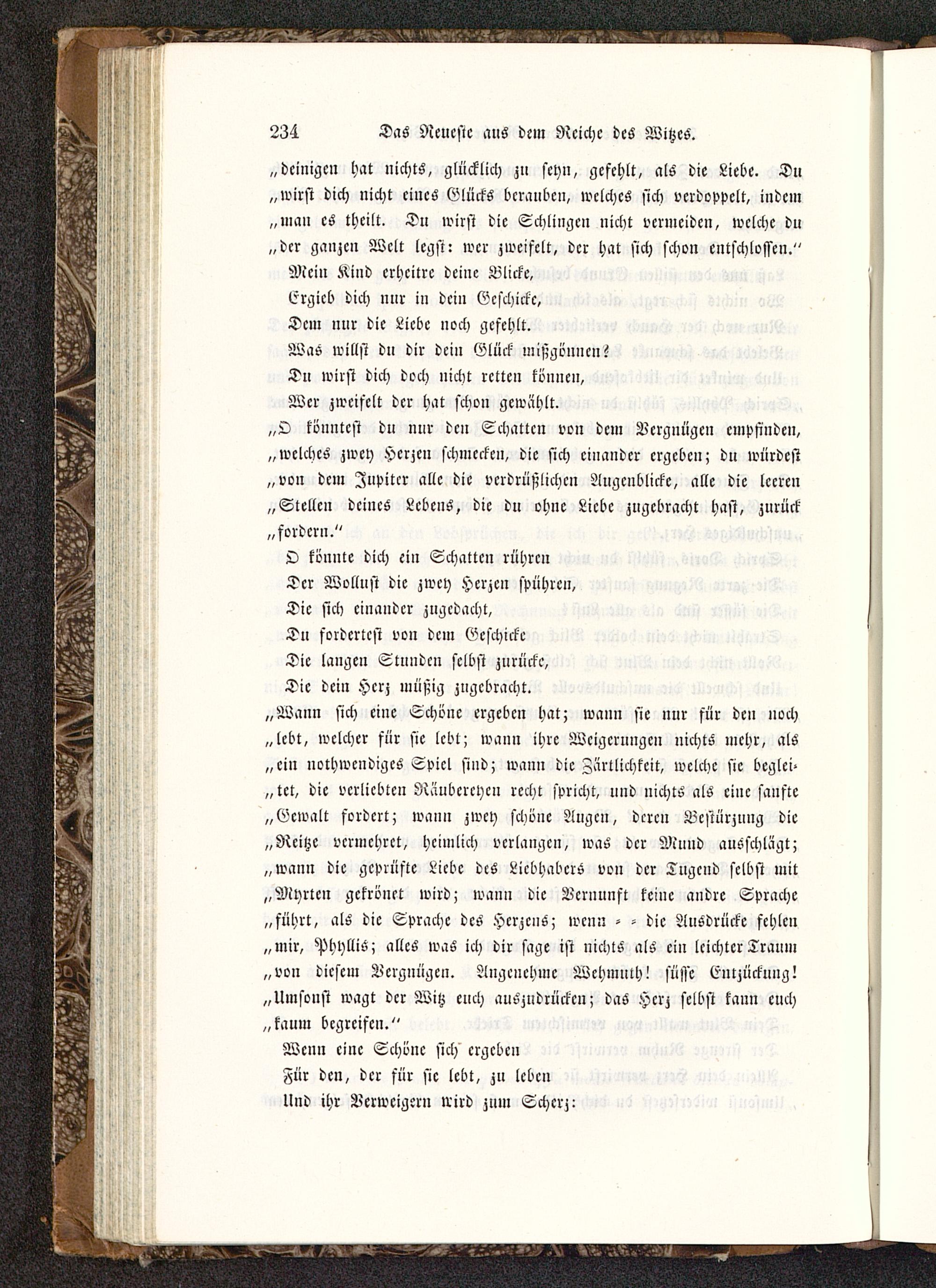 „dcinigcu hat nichts, glücklich zu seyn, gefehlt, als die Liebe. Du„wirst dich nicht eines Glücks berauben, welches sich verdoppelt, indem„man es theilt. Du wirst die Schlingen nicht vermeiden, welche du„der ganzen Welt legst: wer zweifelt, der hat sich schon entschlossen."
