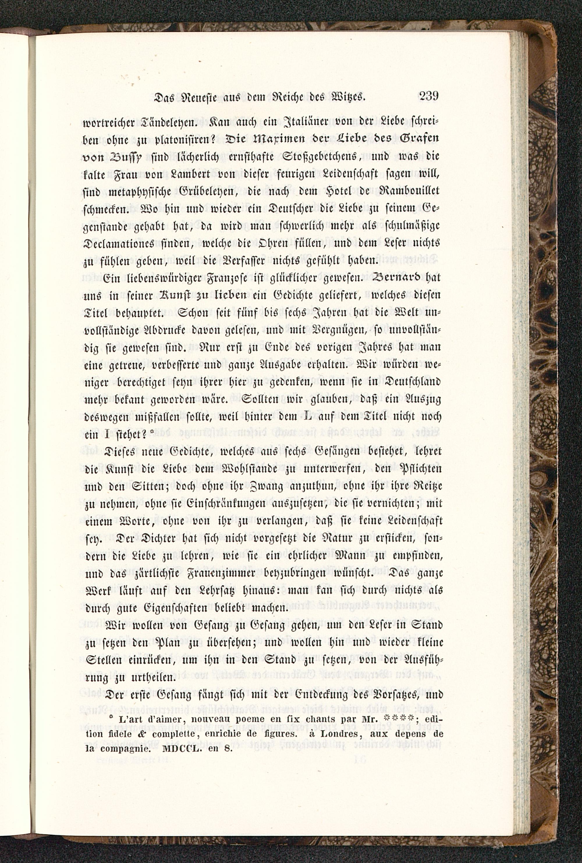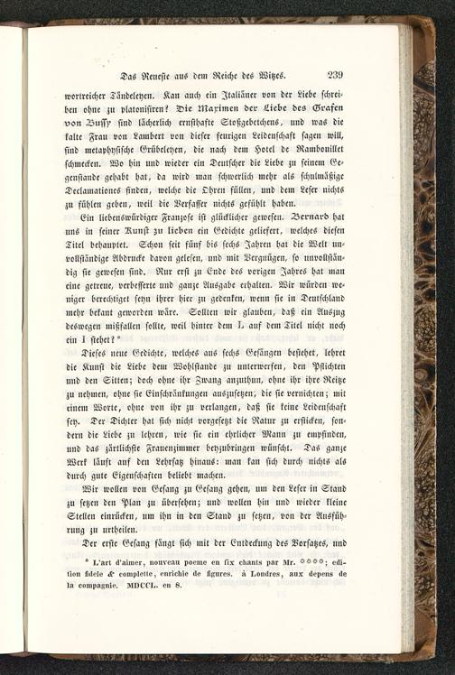 Ein liebenswürdiger Franzose ist glücklicher gewesen. Bernard hatuns in seiner Runst zu lieben ein Gedichte geliefert, welches diesenTitel behauptet. Schon seit fünf bis sechs Jahren hat die Welt un-vollständige Abdrucke davon gelesen, und mit Vergnügen, so unvollstän-dig sie gewesen sind. Nur erst zu Ende des vorigen Jahres hat maneine getreue, verbesserte und ganze Ausgabe erhalten. Wir würden we-niger berechtiget seyn ihrer hier zn gedenken, wenn sie in Deutschland mehr bckant geworden wäre. Sollten wir glauben, daß ein Auszugdeswegen mißfallen sollte, wcil hinter dem 1^ auf dcm Titel nicht nochein I stehet? °