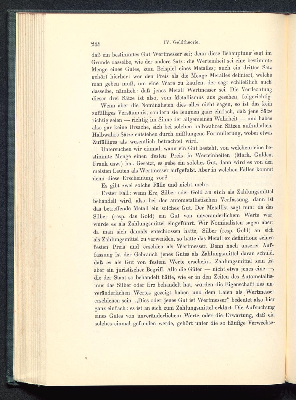 Untersuchen wir einmal, wann ein Gut besteht, von welchem eine be-stimmte Menge einen festen Preis in Werteinheiten (Mark, Gulden,Frank usw.) hat. Gesetzt, es gebe ein solches Gut, dann wird es von denmeisten Leuten als Wertmesser aufgefaßt. Aber in welchen Fällen kommtdenn diese Erscheinung vor?