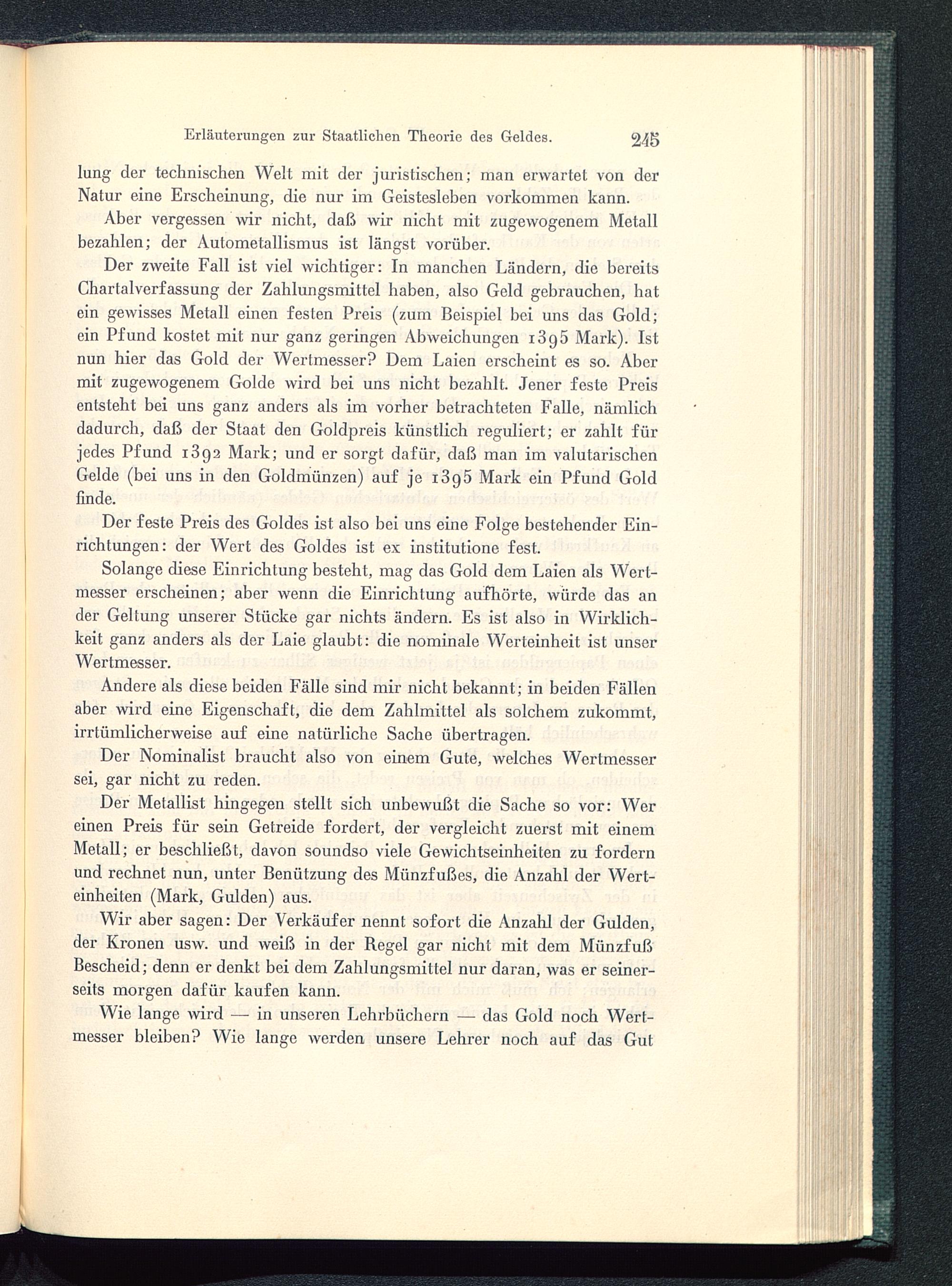 Der zweite Fall ist viel wichtiger: In manchen Ländern, die bereitsChartalverfassung der Zahlungsmittel haben, also Geld gebrauchen, hatein gewisses Metall einen festen Preis (zum Beispiel bei uns das Gold;ein Pfund kostet mit nur ganz geringen Abweichungen i3g5 Mark). Istnun hier das Gold der Wertmesser? Dem Laien erscheint es so. Abermit zugewogenem Golde wird bei uns nicht bezahlt. Jener feste Preisentsteht bei uns ganz anders als im vorher betrachteten Falle, nämlichdadurch, daß der Staat den Goldpreis künstlich reguliert; er zahlt fürjedes Pfund 1892 Mark; und er sorgt dafür, daß man im valutarischenGel de (bei uns in den Goldmünzen) auf je i3g5 Mark ein Pfund Goldfinde.