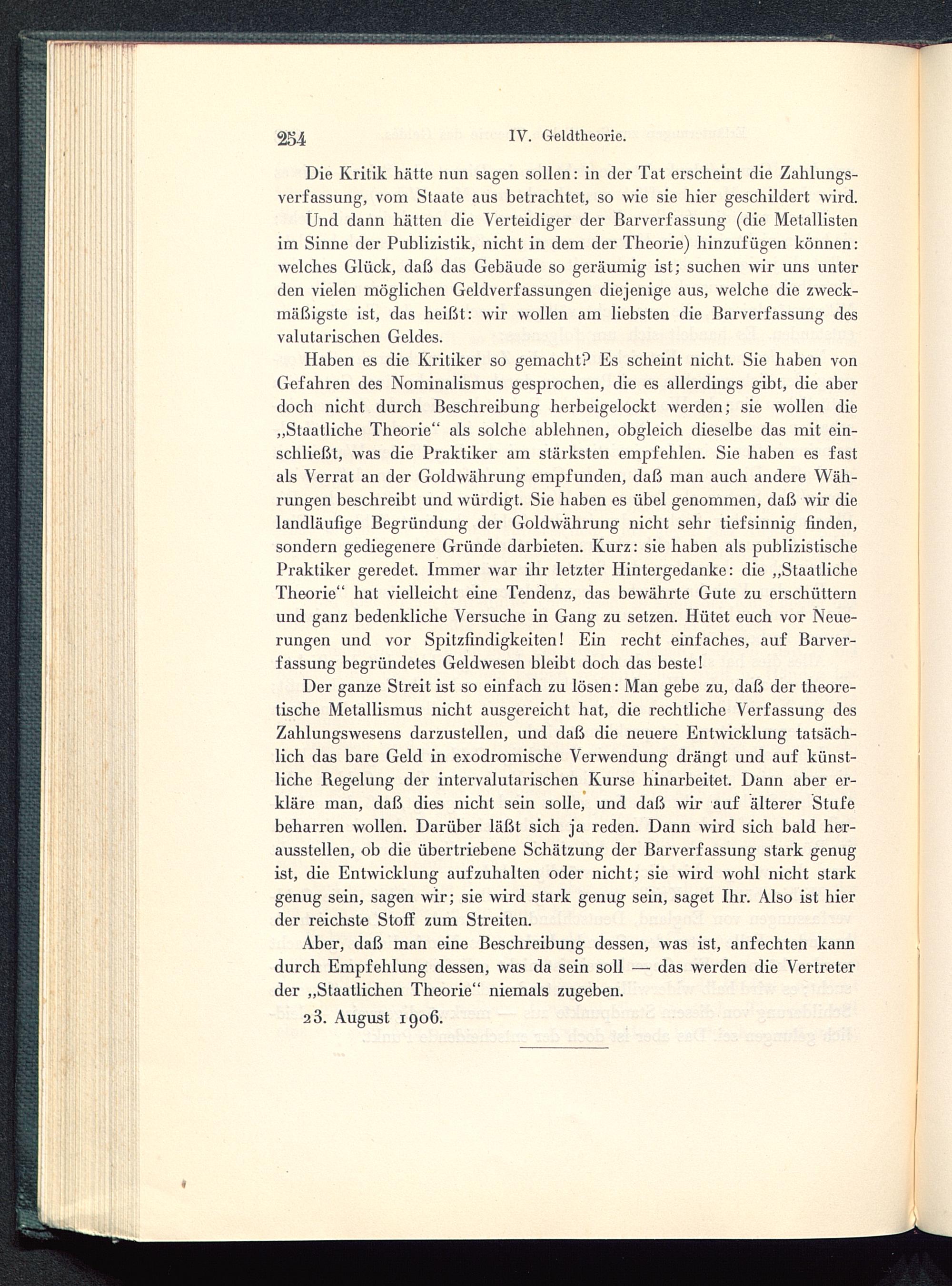 Haben es die Kritiker so gemacht? Es scheint nicht. Sie haben vonGefahren des Nominalismus gesprochen, die es allerdings gibt, die aberdoch nicht durch Beschreibung herbeigelockt werden; sie wollen die„Staatliche Theorie“ als solche ablehnen, obgleich dieselbe das mit ein-schließt, was die Praktiker am stärksten empfehlen. Sie haben es fastals Verrat an der Goldwährung empfunden, daß man auch andere Wäh-rungen beschreibt und würdigt. Sie haben es übel genommen, daß wir dielandläufige Begründung der Goldwährung nicht sehr tiefsinnig finden,sondern gediegenere Gründe darbieten. Kurz: sie haben als publizistischePraktiker geredet. Immer war ihr letzter Hintergedanke: die „StaatlicheTheorie“ hat vielleicht eine Tendenz, das bewährte Gute zu erschütternund ganz bedenkliche Versuche in Gang zu setzen. Hütet euch vor Neue-rungen und vor Spitzfindigkeiten! Ein recht einfaches, auf Barver-fassung begründetes Geldwesen bleibt doch das beste!