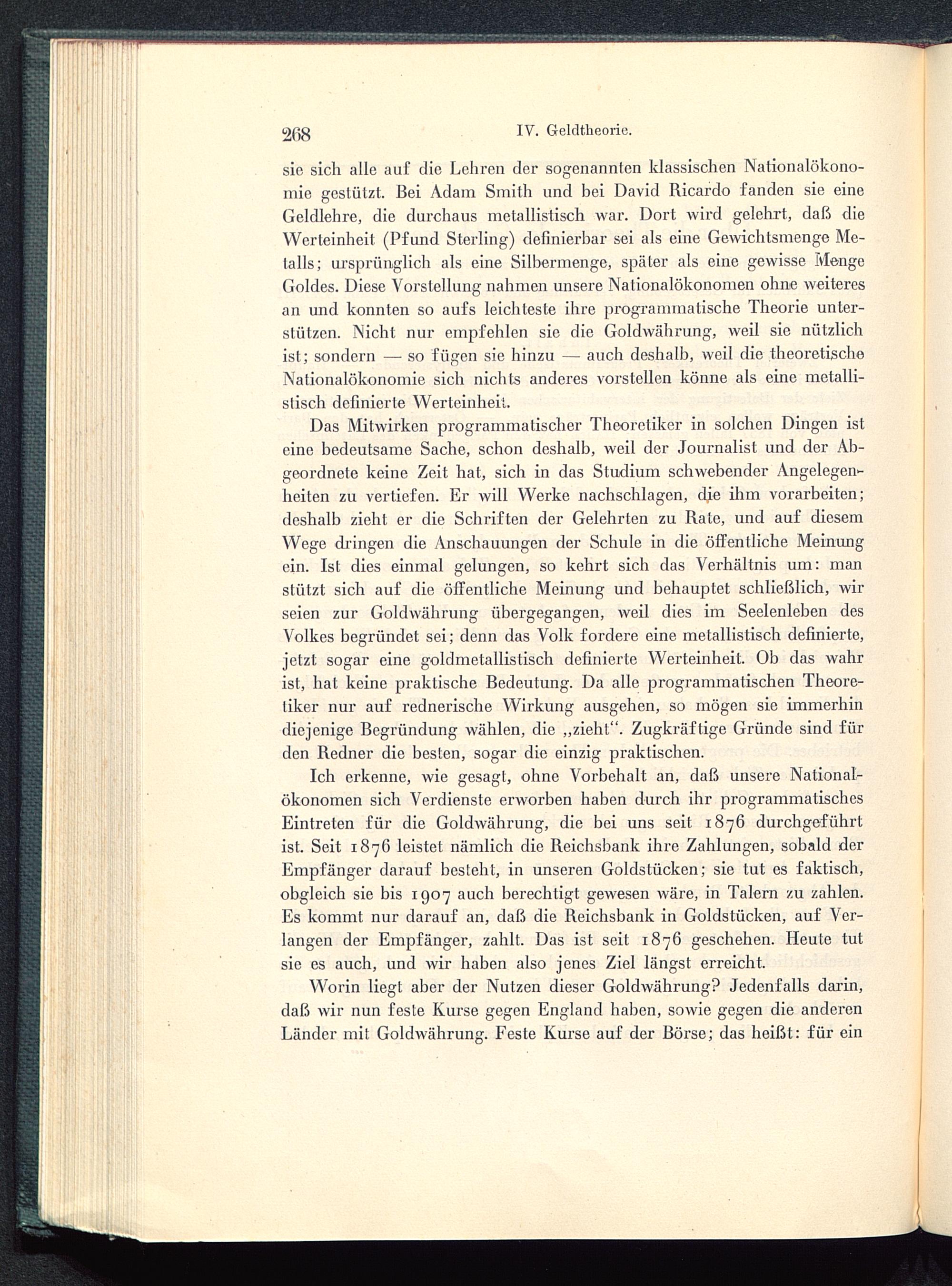 sie sich alle auf die Lehren der sogenannten klassischen Nationalökono-mie gestützt. Bei Adam Smith und bei David Ricardo fanden sie eineGeldlehre, die durchaus metallistisch war. Dort wird gelehrt, daß dieWerteinheit (Pfund Sterling) definierbar sei als eine Gewichtsmenge Me-talls; ursprünglich als eine Silbermenge, später als eine gewisse MengeGoldes. Diese Vorstellung nahmen unsere Nationalökonomen ohne weiteresan und konnten so aufs leichteste ihre programmatische Theorie unter-stützen. Nicht nur empfehlen sie die Goldwährung, weil sie nützlichist; sondern — so fügen sie hinzu — auch deshalb, weil die theoretischeNationalökonomie sich nichts anderes vorstellen könne als eine melalli-slisch definierte Werteinheit.