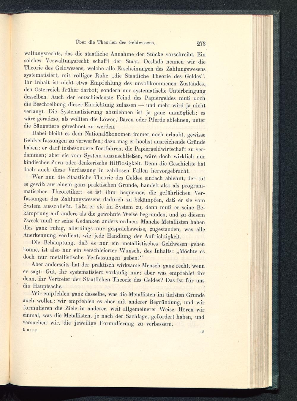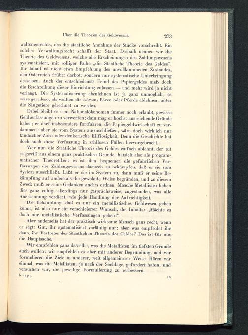 Aber anderseits hat der praktisch wirksame Mensch ganz recht, wenner sagt: Gut, ihr systematisiert vorläufig nur; aber was empfehlet ihrdenn, ihr Vertreter der Staatlichen Theorie des Geldes? Das ist für unsdie Hauptsache.