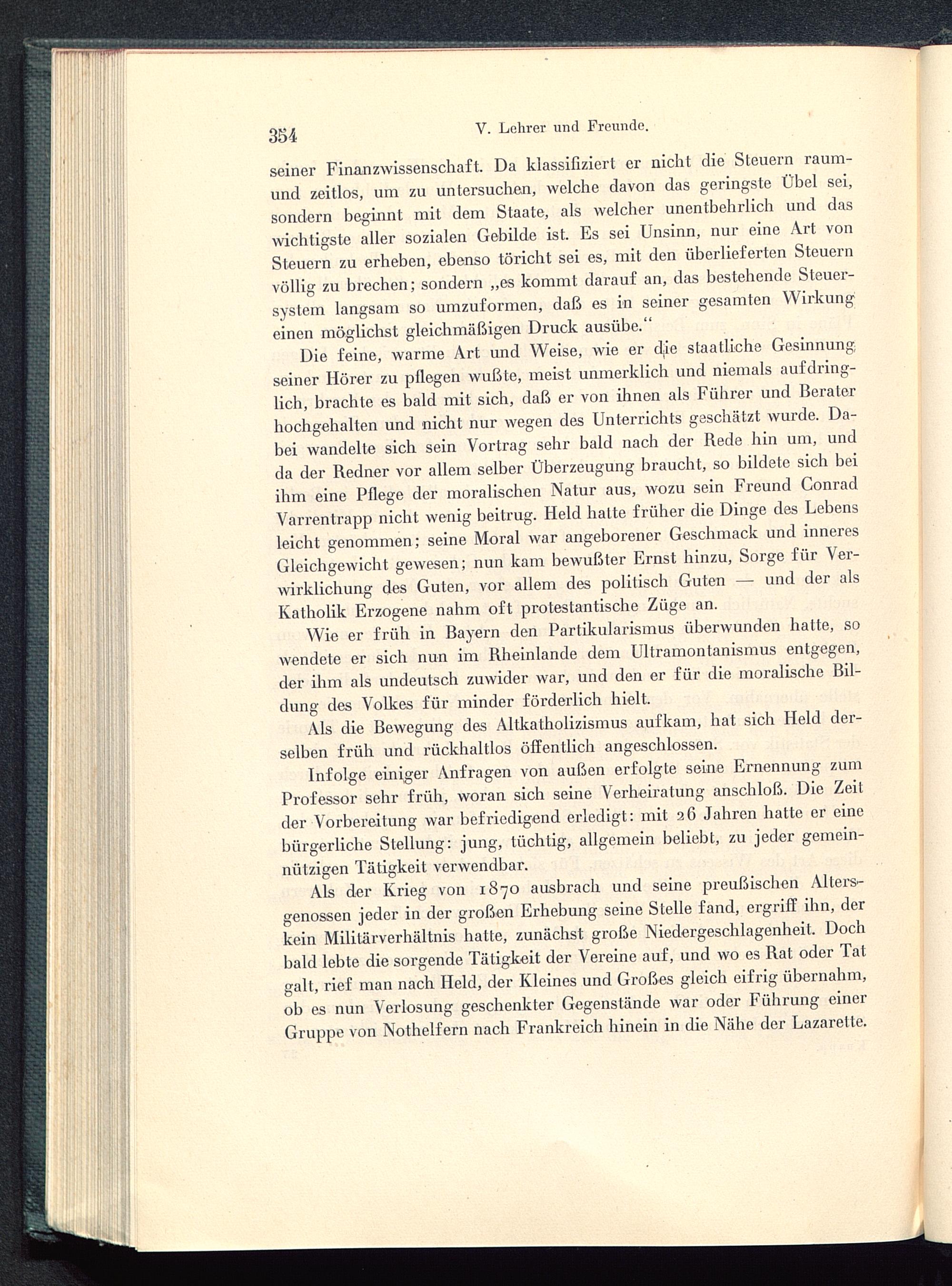 Die feine, warme Art und Weise, wie er dje staatliche Gesinnungseiner Hörer zu pflegen wußte, meist unmerklich und niemals aufdring-lich, brachte es bald mit sich, daß er von ihnen als Führer und Beraterhochgehalten und nicht nur wegen des Unterrichts geschätzt wurde. Da-bei wandelte sich sein Vortrag sehr bald nach der Rede hin um, undda der Redner vor allem selber Überzeugung braucht, so bildete sich beiihm eine Pflege der moralischen Natur aus, wozu sein Freund ConradVarrentrapp nicht wenig beitrug. Held hatte früher die Dinge des Lebensleicht genommen; seine Moral war angeborener Geschmack und inneresGleichgewicht gewesen; nun kam bewußter Ernst hinzu, Sorge für Ver-wirklichung des Guten, vor allem des politisch Guten — und der alsKatholik Erzogene nahm oft protestantische Züge an.