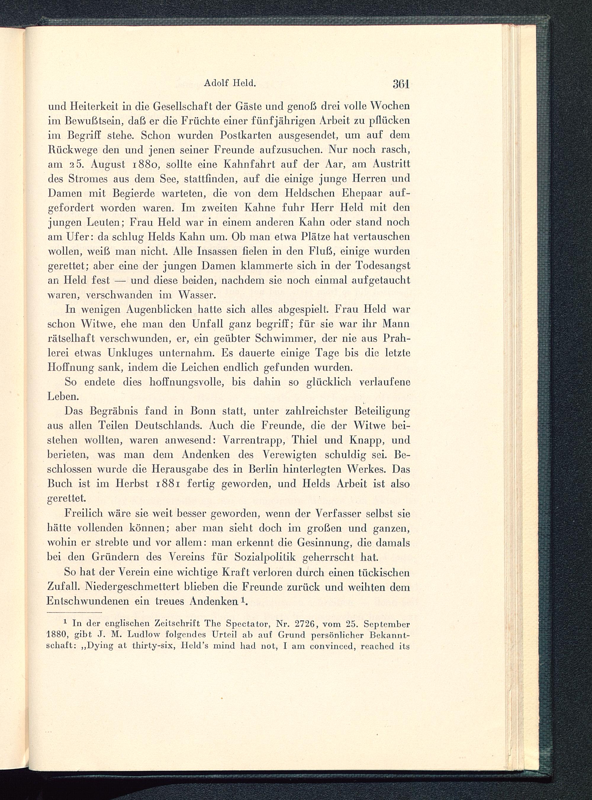und Heiterkeit in die Gesellschaft der Gäste und genoß drei volle Wochenim Bewußtsein, daß er die Früchte einer fünfjährigen Arbeit zu pflückenim Begriff stehe. Schon wurden Postkarten ausgesendet, um auf demBückwege den und jenen seiner Freunde aufzusuchen. Nur noch rasch,am 2 5 . August 1880, sollte eine Kahnfahrt auf der Aar, am Austrittdes Stromes aus dem See, stattfinden, auf die einige junge Herren undDamen mit Begierde warteten, die von dem Heldschen Ehepaar auf-gefordert worden waren. Im zweiten Kahne fuhr Herr Held mit denjungen Leuten; Frau Held war in einem anderen Kahn oder stand nocham Ufer: da schlug Heids Kahn um. Ob man etwa Plätze hat vertauschenwollen, weiß man nicht. Alle Insassen fielen in den Fluß, einige wurdengerettet; aber eine der jungen Damen klammerte sich in der Todesangstan Held fest — und diese beiden, nachdem sie noch einmal aufgetauchtwaren, verschwanden im Wasser.